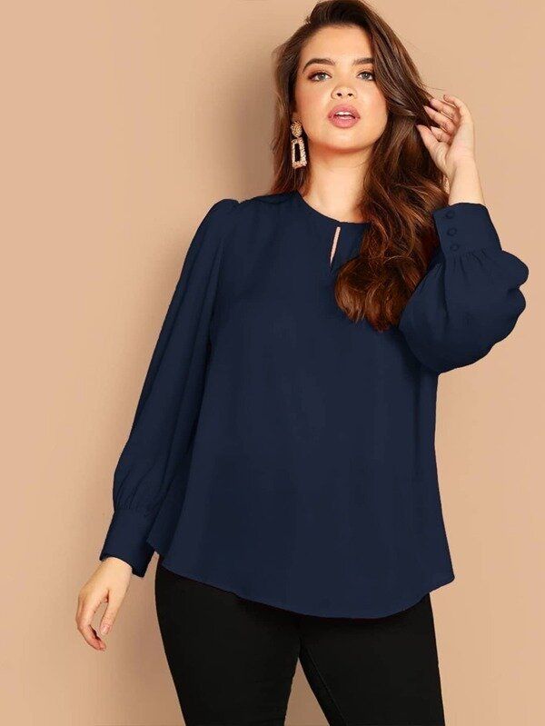 SHEIN プラス ボタン 袖口 カーブヘム ブラウス