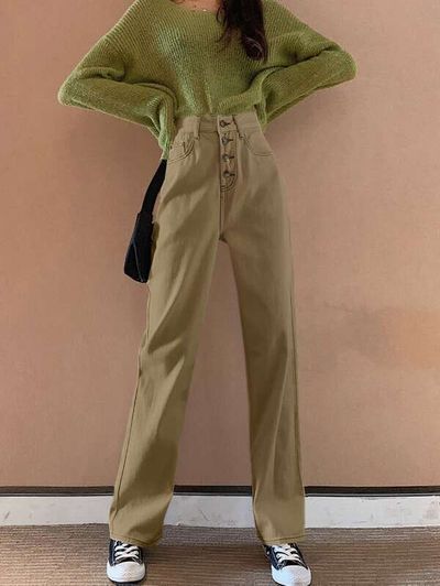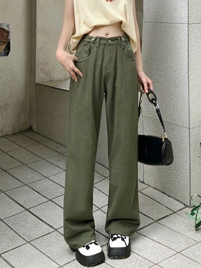 カジュアルに着られる、カーキカラーのワイドシルエットのデニム。口コミによると、色も形もとてもかわいいそう。コーデの幅も広がりそうですね。