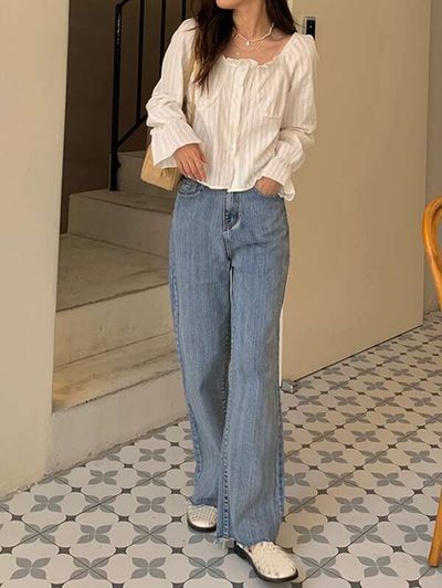 きれいめコーデにも使える淡いブルーのデニム。ゆったりと履くことができそうですね。白のブラウスと合わせてきれいめコーデにしたり、もちろんTシャツなどと合わせてカジュアルコーデにすることもできそうですね。