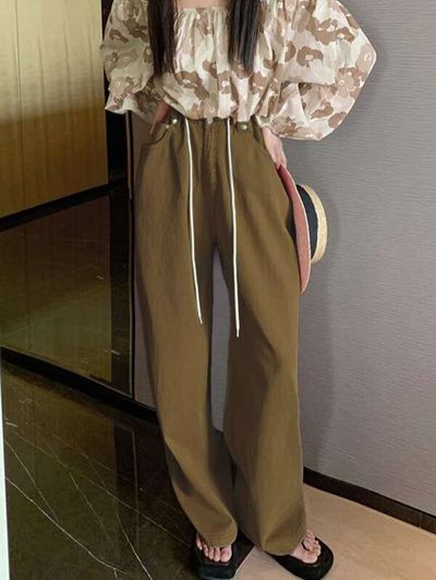 ブラウンカラーのゆったりと着れるデニム。口コミによると、ウエストがすごく絞れるそう。ハイウエストにもできるので、脚長効果もあるようです。