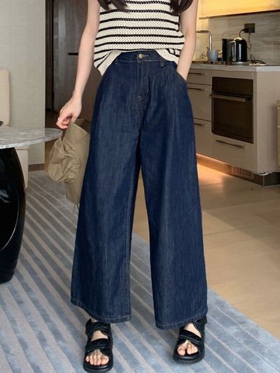 ハイウエストでワイドタイプのデニム。濃い色なのできれいめコーデで合わせることができます。ボーダーのシャツとの相性もよさそうですね!