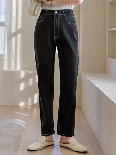 シンプルなブラックのジーンズ。口コミによると、足が長く見えてすっきり履けるそう。低身長でもかっこよく履けるようです。