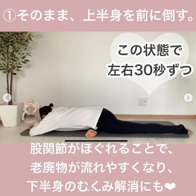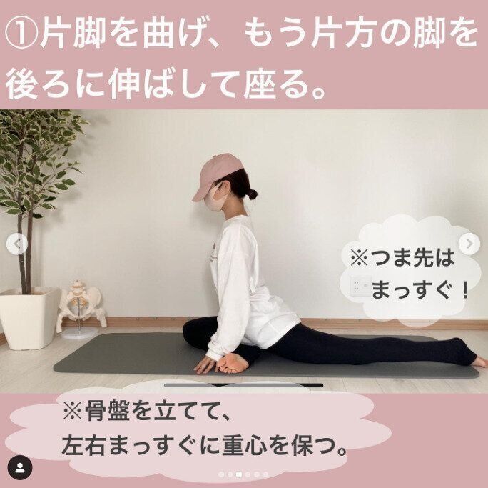 股関節が硬いと、骨盤の傾きも生じやすくなり、姿勢が悪くなると言います。その結果、下半身太りだけではなく、ぽっこりお腹の原因にもなるのだそう。こちらは、骨盤まわりをほぐしたいときのおすすめのストレッチ。写真のように、片足を曲げ、もう片方の足をうしろに伸ばして座ります。