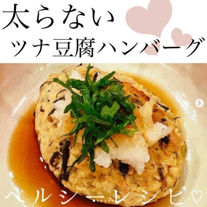 健康的な食生活も大切にしているmomo.bodymake8さん。食べたいものを我慢するのではなく、ヘルシーな食材にうまく置き換えることなどで、楽しく継続しています。こちらは「ツナ豆腐ハンバーグ」。つくりかたをご紹介しましょう。
