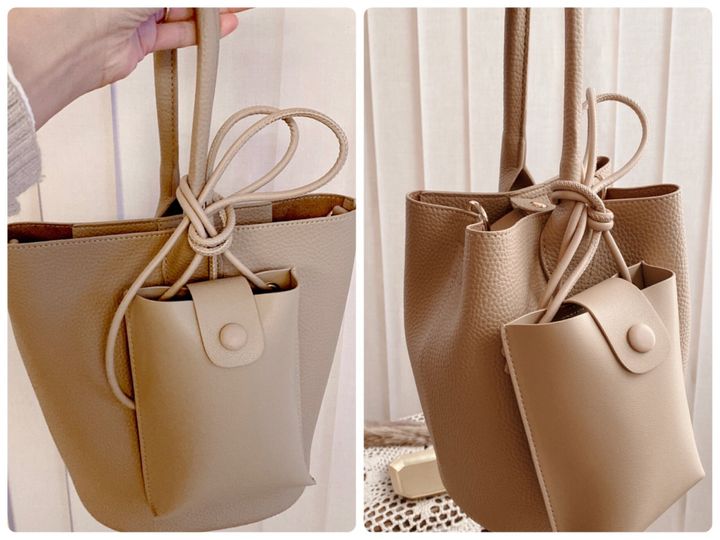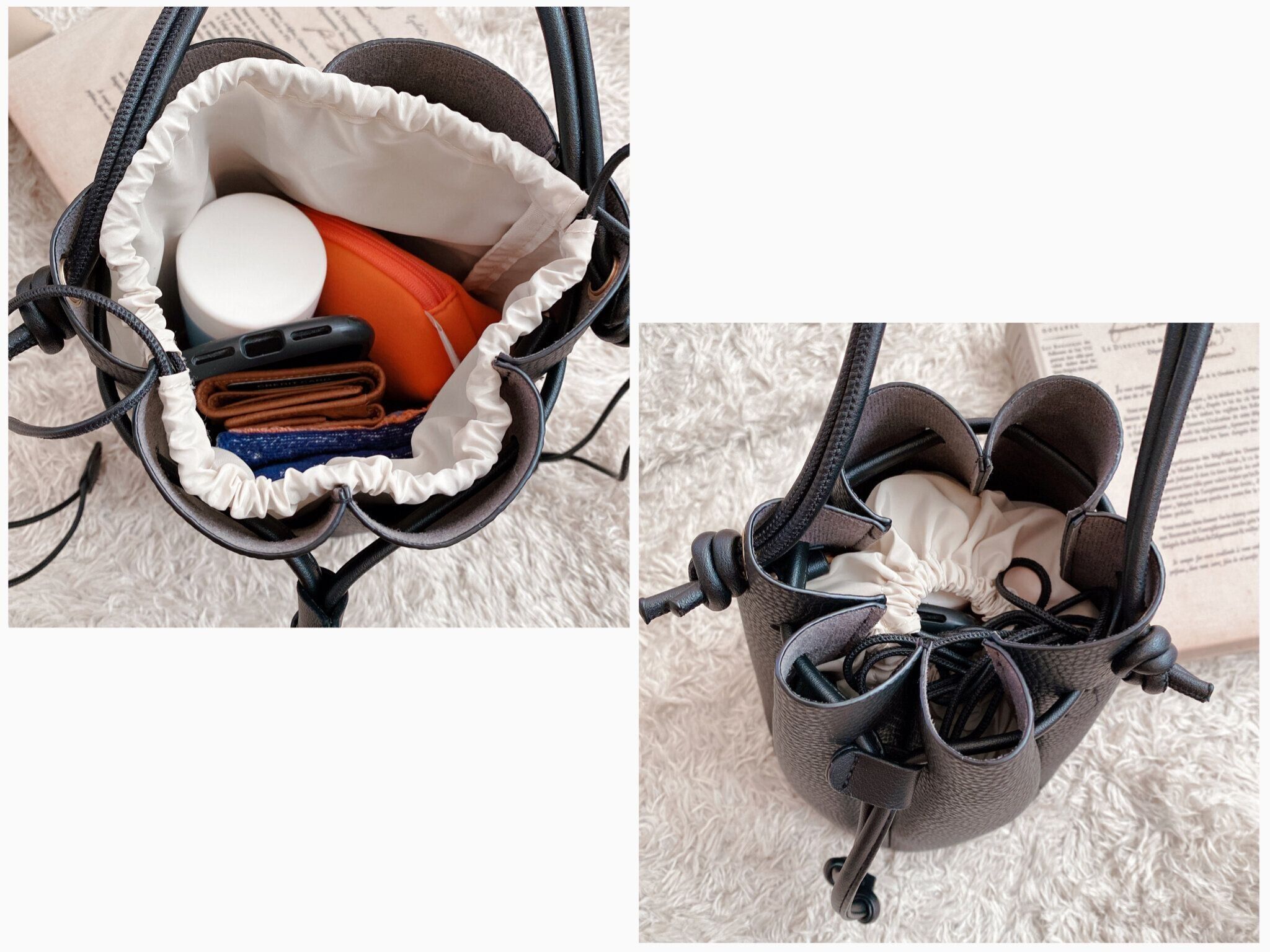 バケツ型の巾着バッグに幅のあるプリーツのデザインが特徴です。ややシボ感のある柔らかなレザー調素材で、ハンドル部分も柔らかな細めのコードが2本使用されています。こちらも金具が最小限しか使用されていないため、高見えでより洗練された雰囲気に仕上がっています。