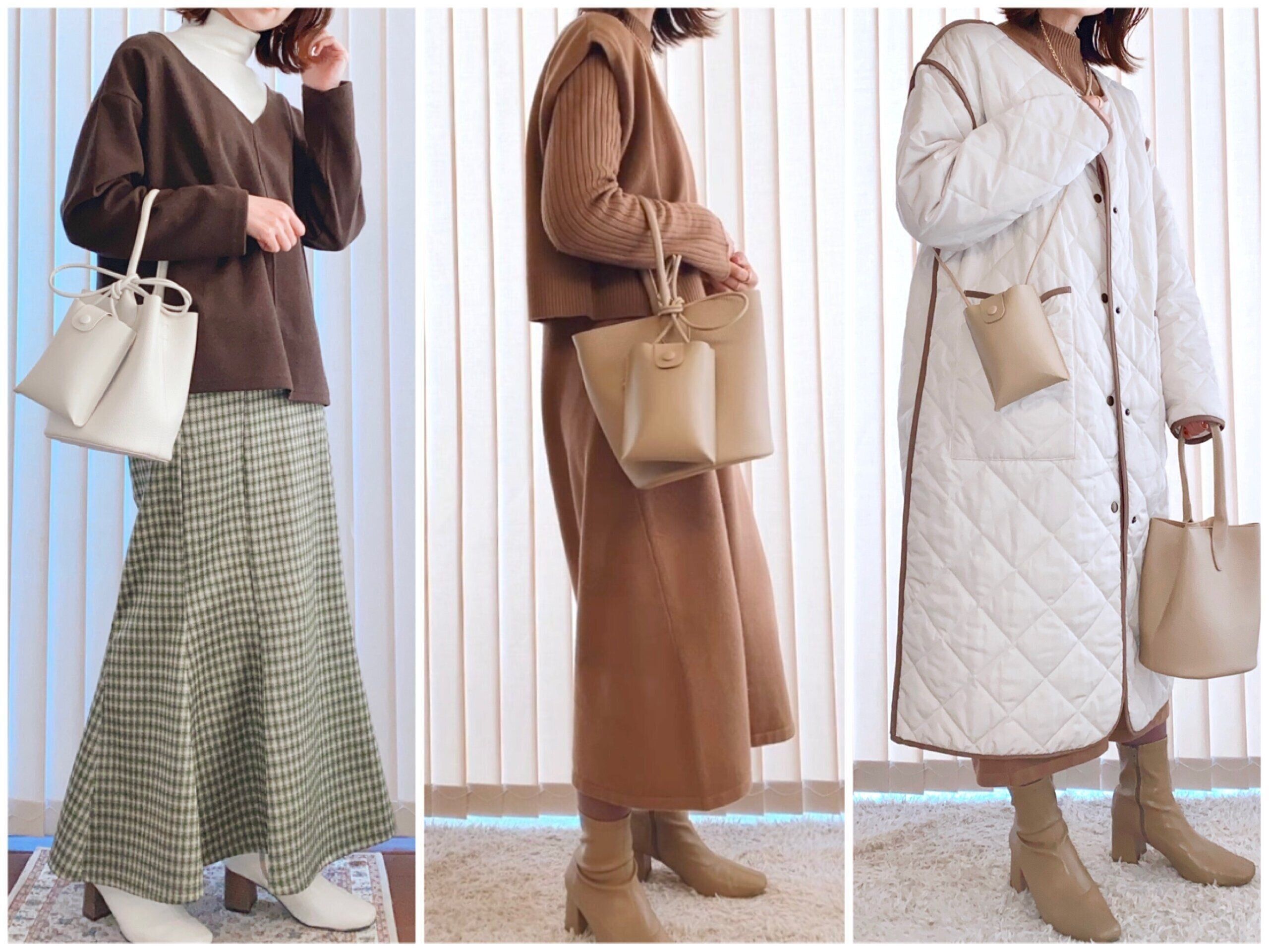 それぞれ淡色コーデに合わせてみました。新色のベージュはミルクティーの様な淡い色合いで特にお気に入りです。