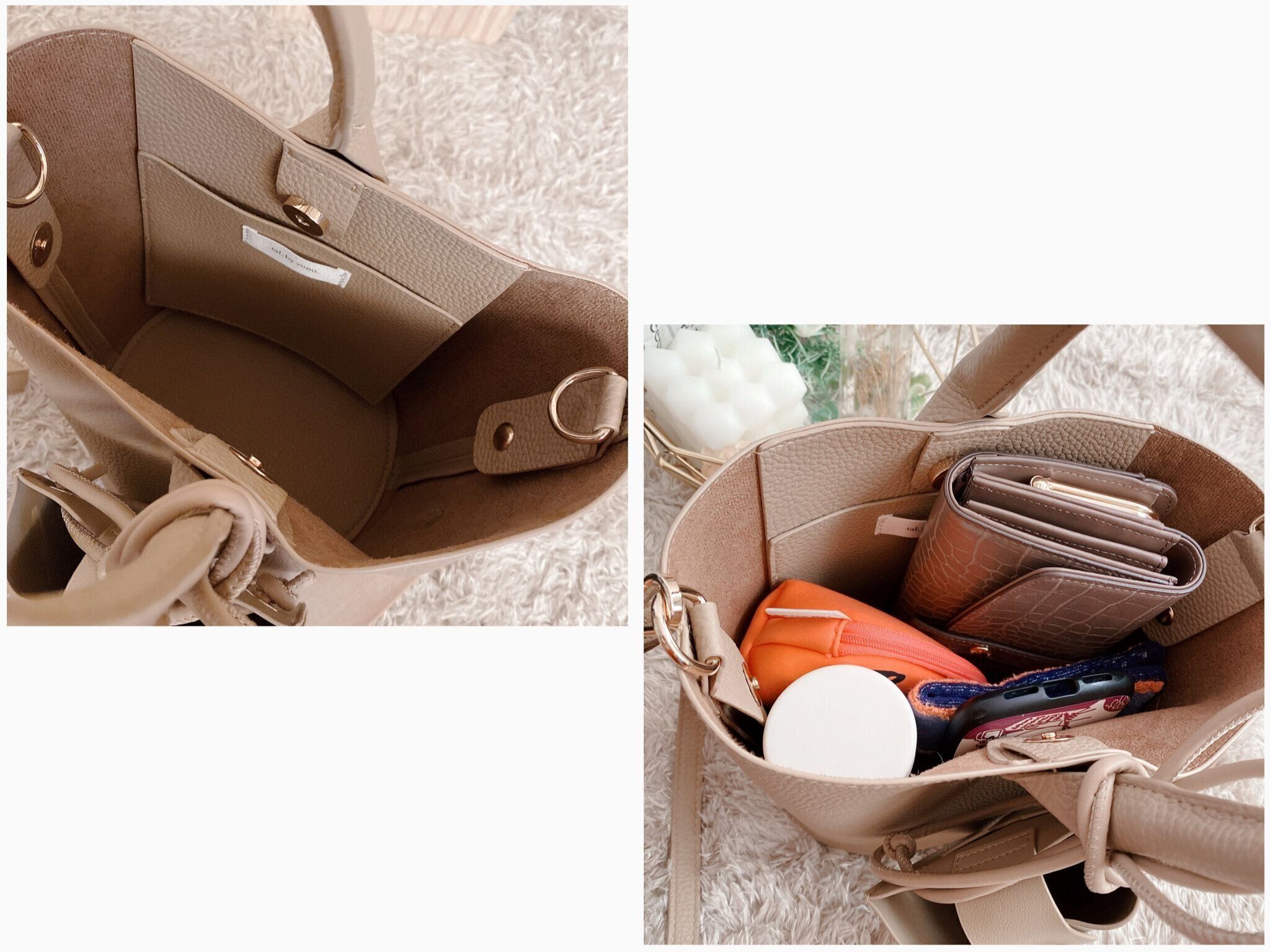 『淡色コーデ』で人気のインフルエンサー yumi.さんのディレクションブランド、『tal.by yumi』のポシェット付きバッグです。ワンハンドルでハイセンスなデザインなうえに、スマホポシェット付きで大変便利です。