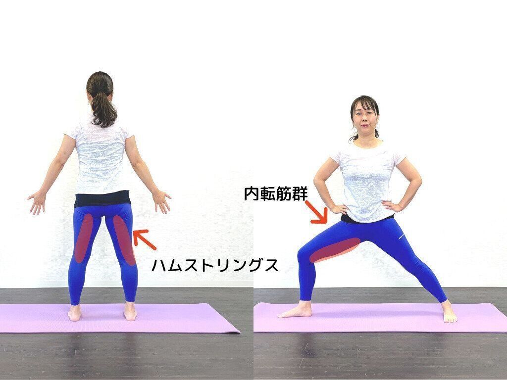 太ももの内側(内転筋群)と太ももの裏側の筋肉(ハムストリングス)にジワジワ効いているのを感じます。