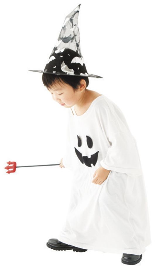 定番のお化け仮装も根強い人気。全身モノトーンでまとめれば、映画に出てきそうな古典的なお化けに。Tシャツは大人用をだるっと着せて、ところどころ破るとより本格的です。白Tを着せてから、フェルトで作った顔パーツを接着剤で貼ると、位置が決まりやすい!