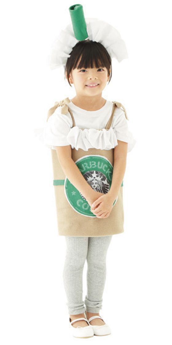 ストロー風筒つきカチューシャと、カップ風ボディで、フラッペちゃんが完成。カップは、生地を貼りつけた型紙を、筒状に巻いて作るだけ。全身を、白×緑×茶の3色でコーディネートするのがキモです。フリルは、たっぷりにするほどかわいさアップ!
