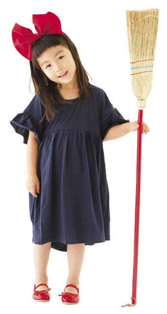 赤リボンと紺ワンピで、魔法使いの女の子に。フェルトとカチューシャで作ったリボンは、大きめサイズが華やかに見せるコツ。靴も赤で統一すると◎。ワンサイズ大きめの紺ワンピを選ぶと、よりそっくりに♪