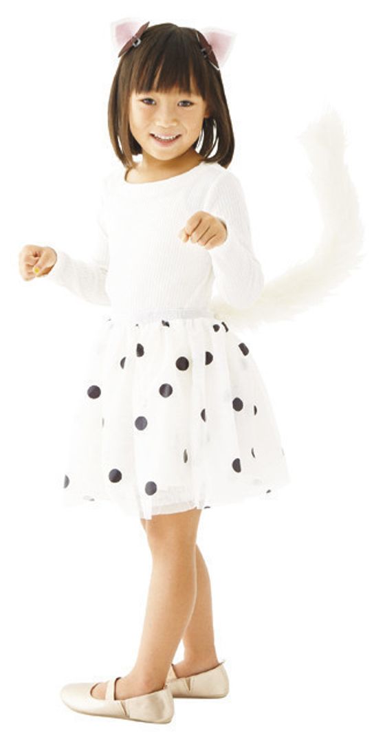 ボリュームの出るチュチュスカートと猫耳で、かわいいキャットガールが登場。服は上下どちらかを柄物にするとメリハリが出ておしゃれ感がアップします。猫耳は三角形に切ったフェルトをパッチン留めに貼って髪にオン。手芸店などで買えるしっぽをつけても◎