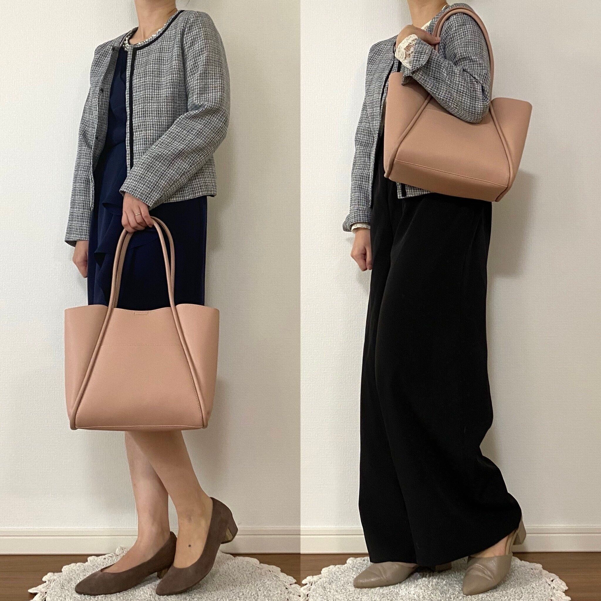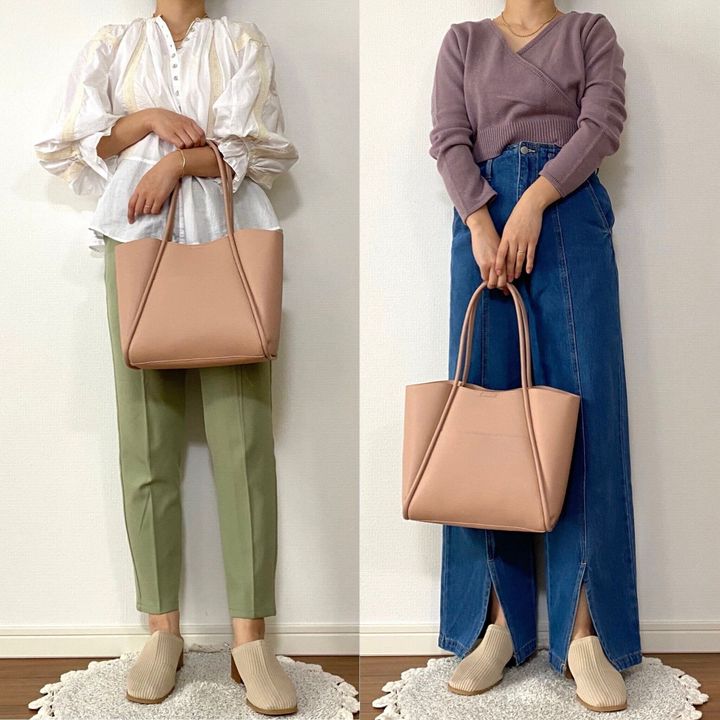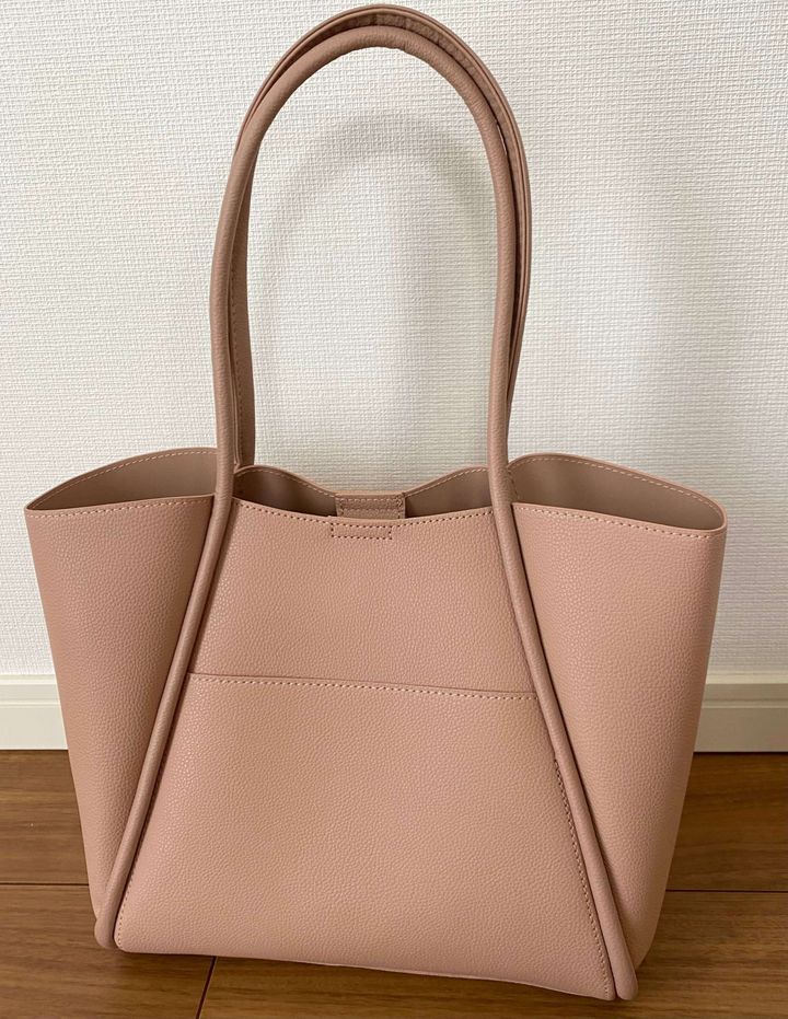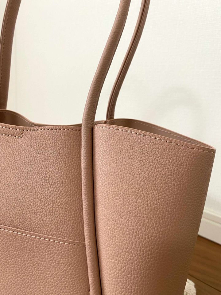 光の加減で見え方が多少変わりますが、ピンクベージュのようにも見える上品な色味です。よく見るとシボ感のある合皮素材で、持ち手が一緒に縫い込まれているデザインも今っぽいですよね。