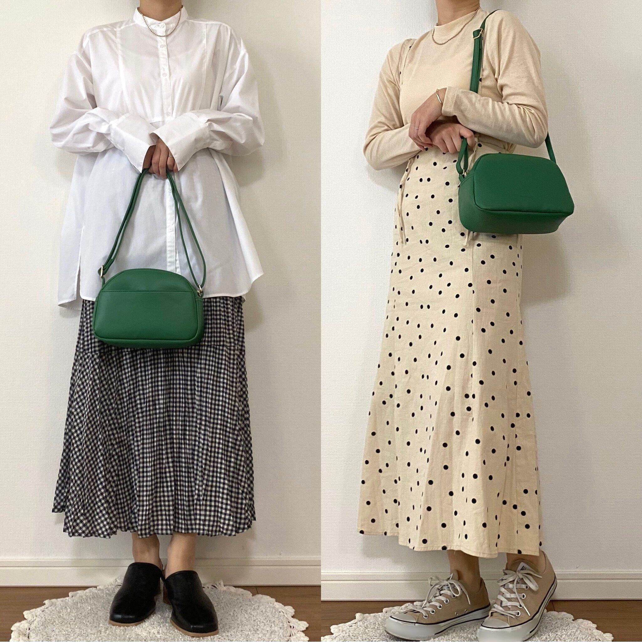 コロンとしたフォルムが可愛らしい、はっきりとしたグリーンカラーが特徴のショルダーバッグです。