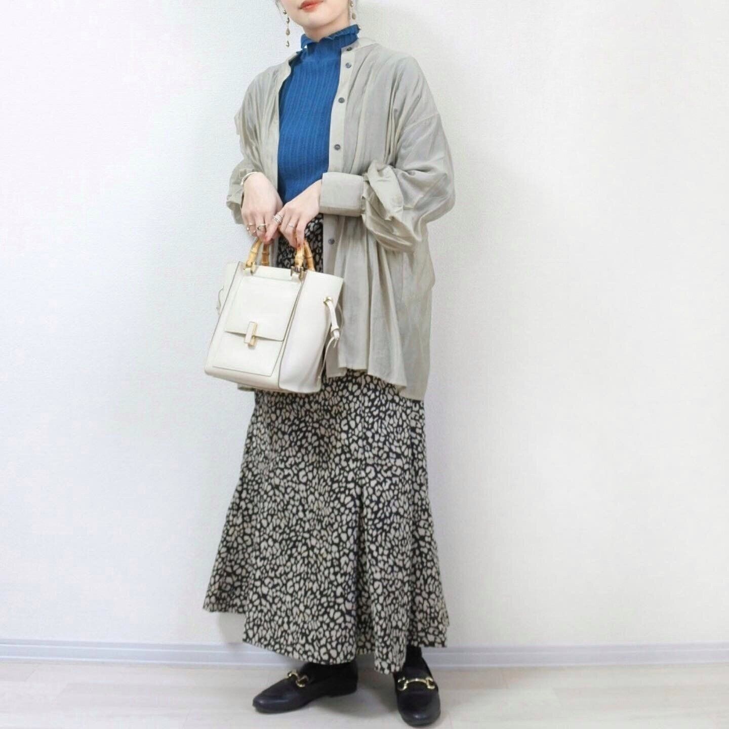 ボトムスには柔らかい印象のブラウン系のレザースカートを合わせるとよりお洒落上級者なコーディネートに仕上がります。