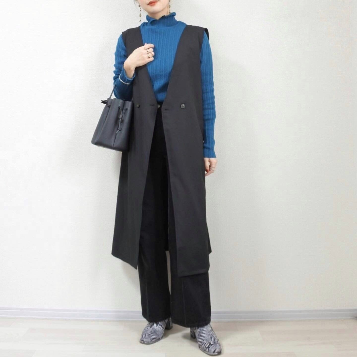 全体をブラックにまとめることによってよりブルーのニットが映えて高見えするコーディネートになります。