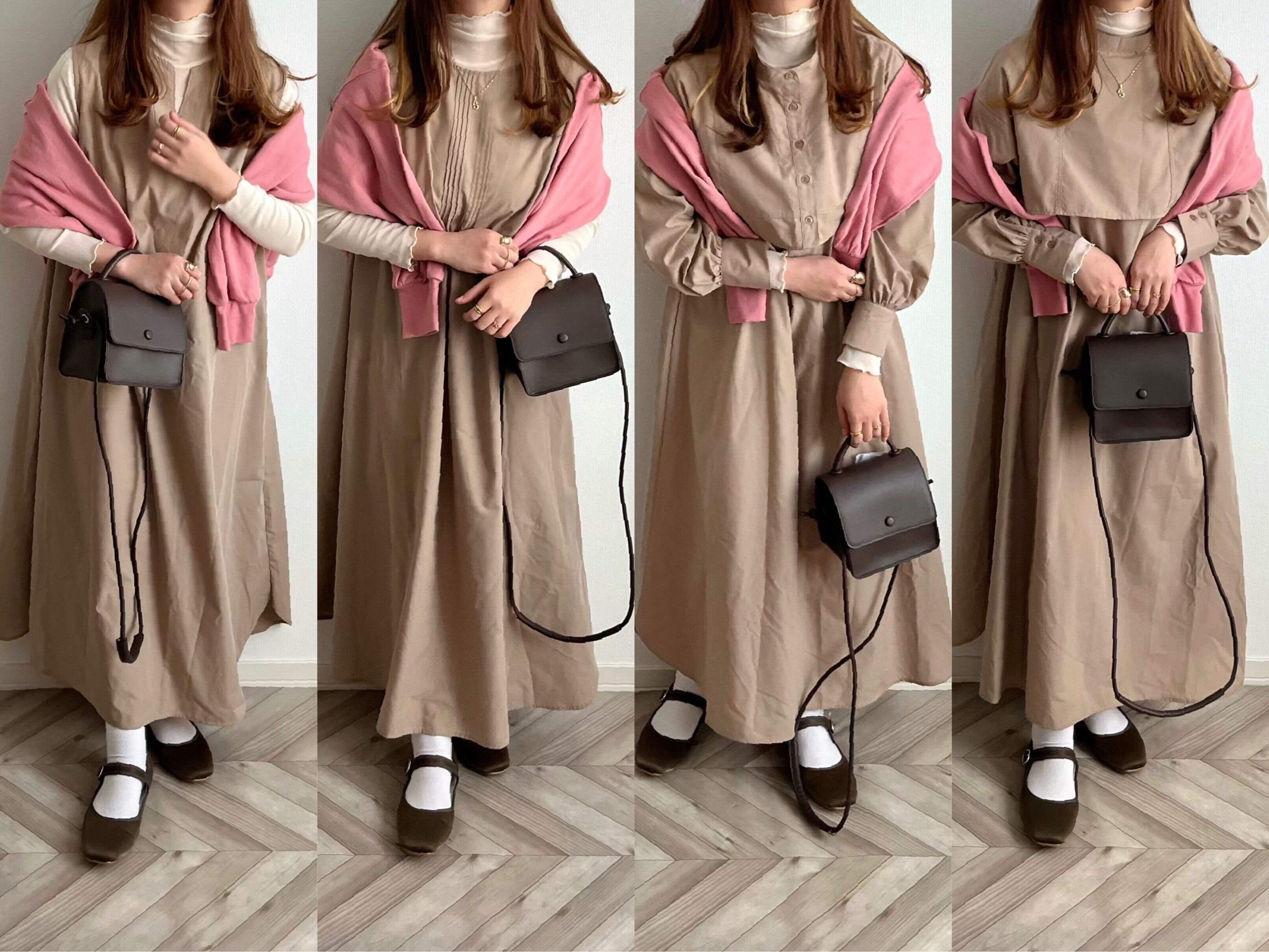 先ほどのコーデに春を意識してピンクのカーディガンを肩がけしてみました。差し色が入るとこんなにも華やかな雰囲気になります。