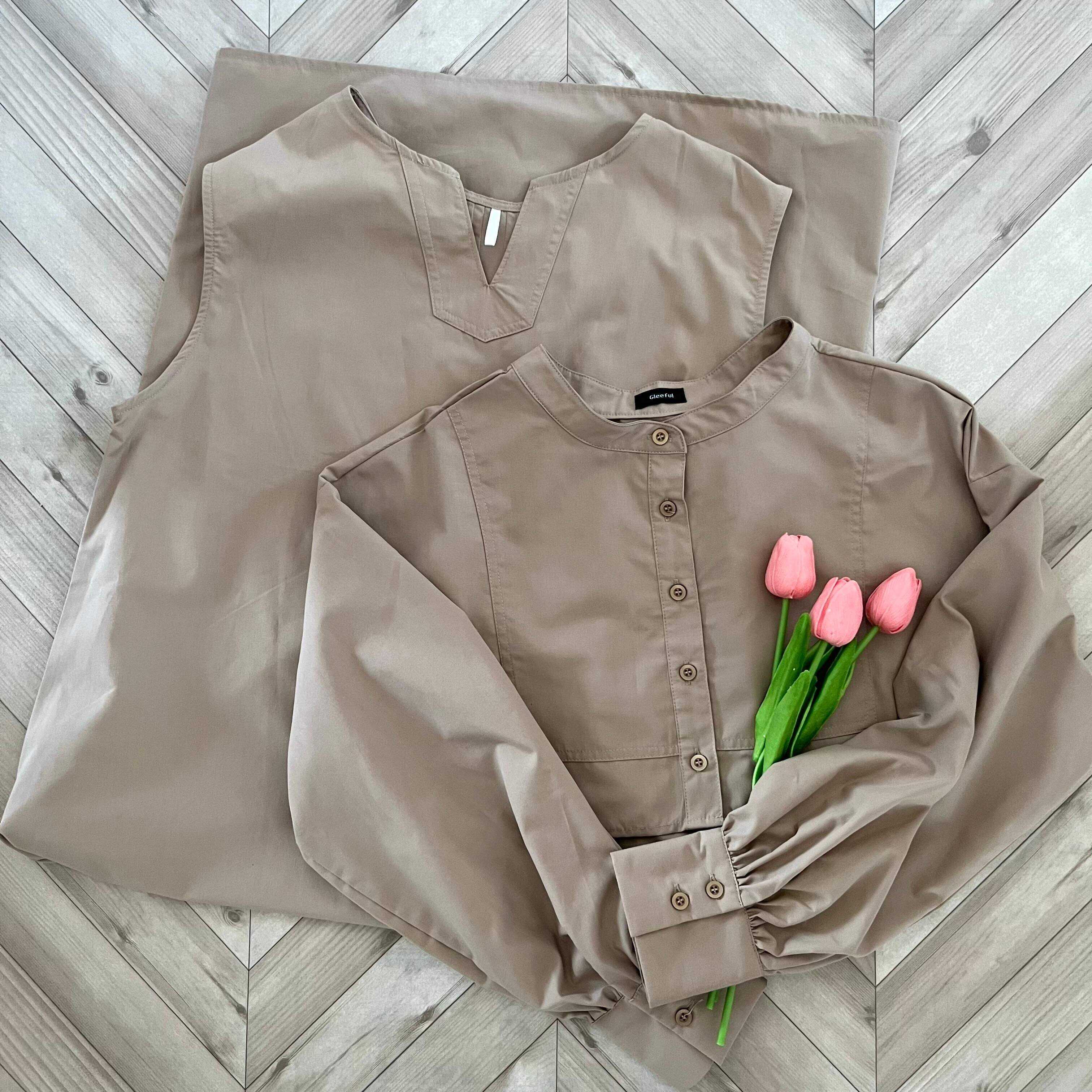 パッと見、デザイン性はあるもののなんの変哲もないようなワンピースですが、実はこれ、ショート丈のバンドカラーシャツとノースリーブのワンピースがセットになったものなんです。
