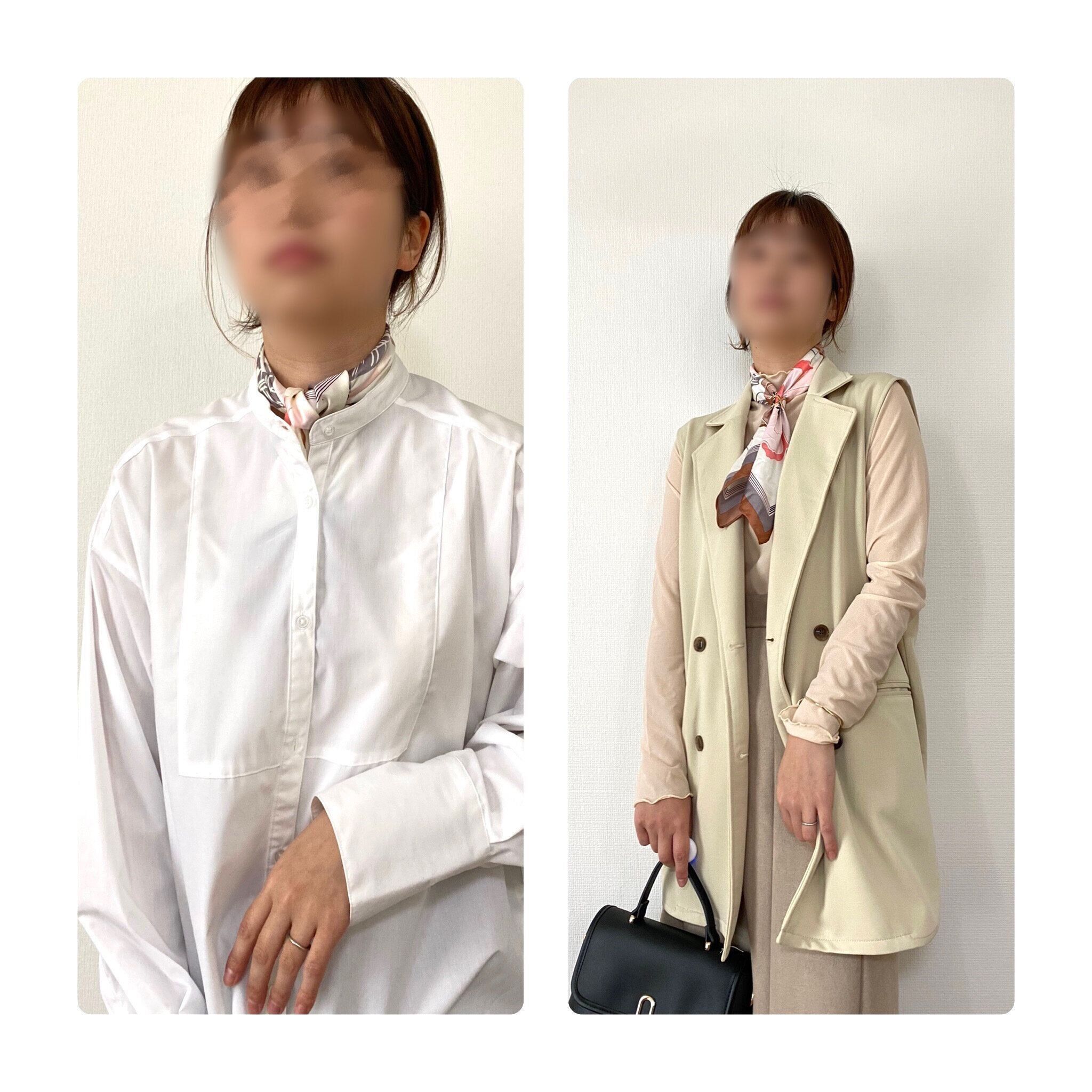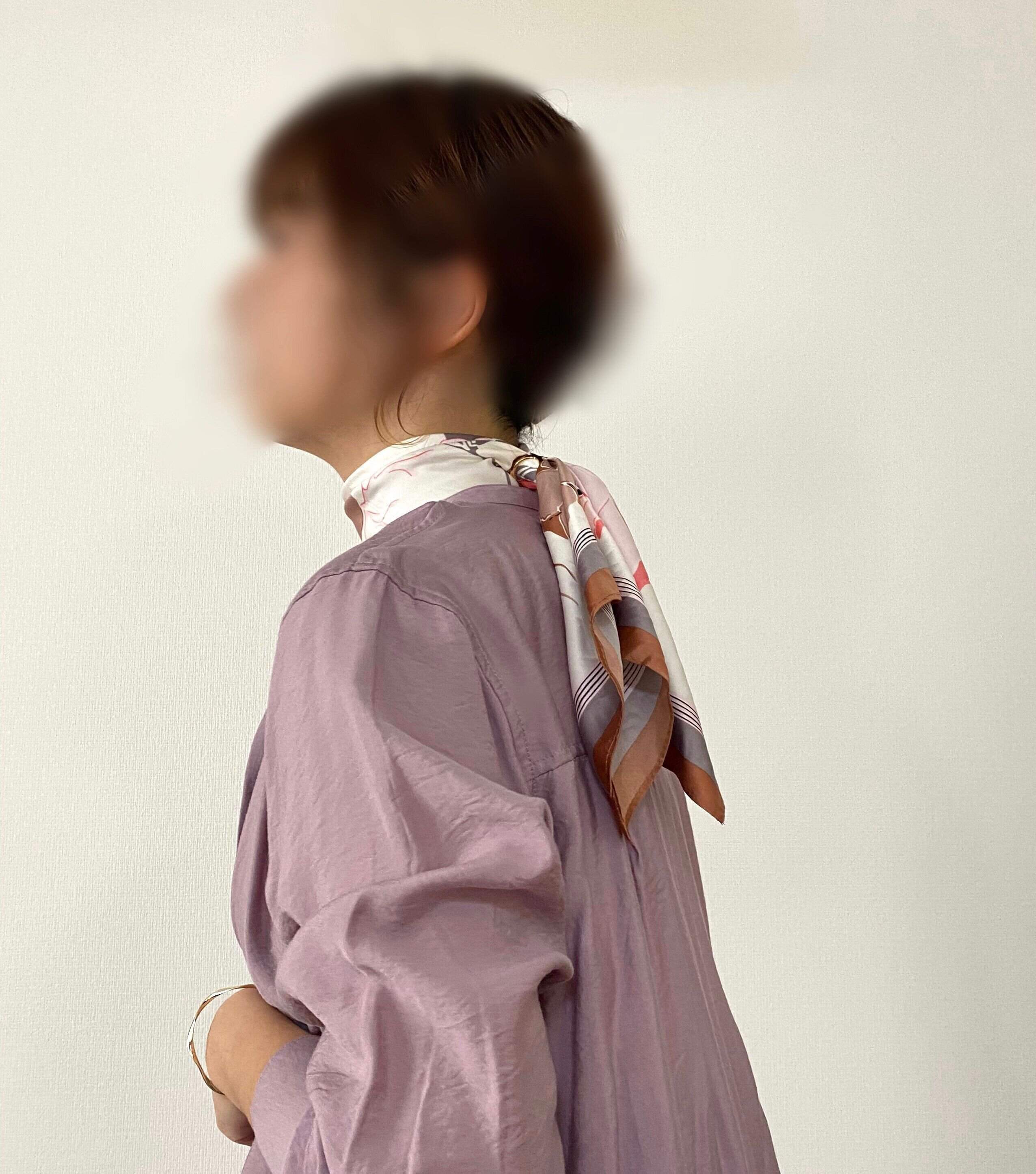 首元にスカーフがあるだけで顔まわりもパッと明るくなり、上品な印象に見せてくれます。