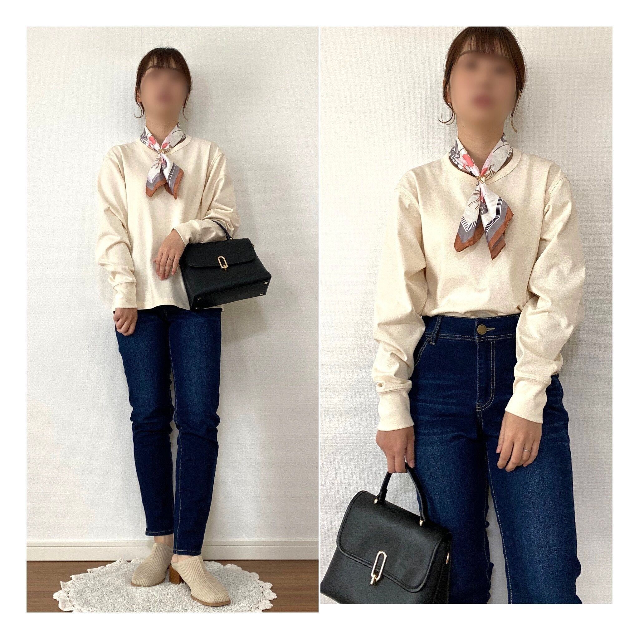 デニムとロンTのカジュアルコーデにスカーフでアクセント。