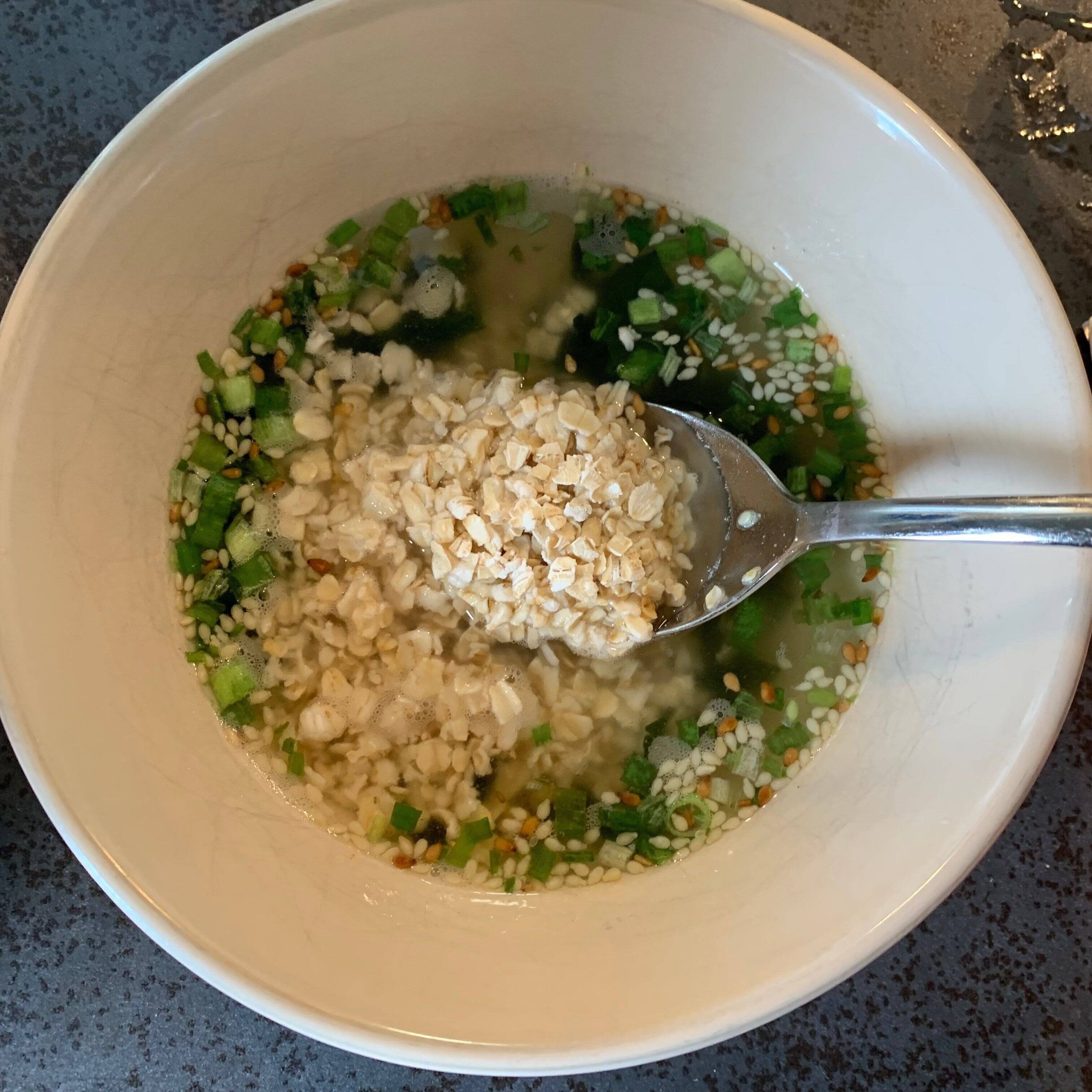 2分待てば、わかめたっぷりのオートミールおじやの完成。スープにはホタテの風味がきいているので、食べ応え抜群です。