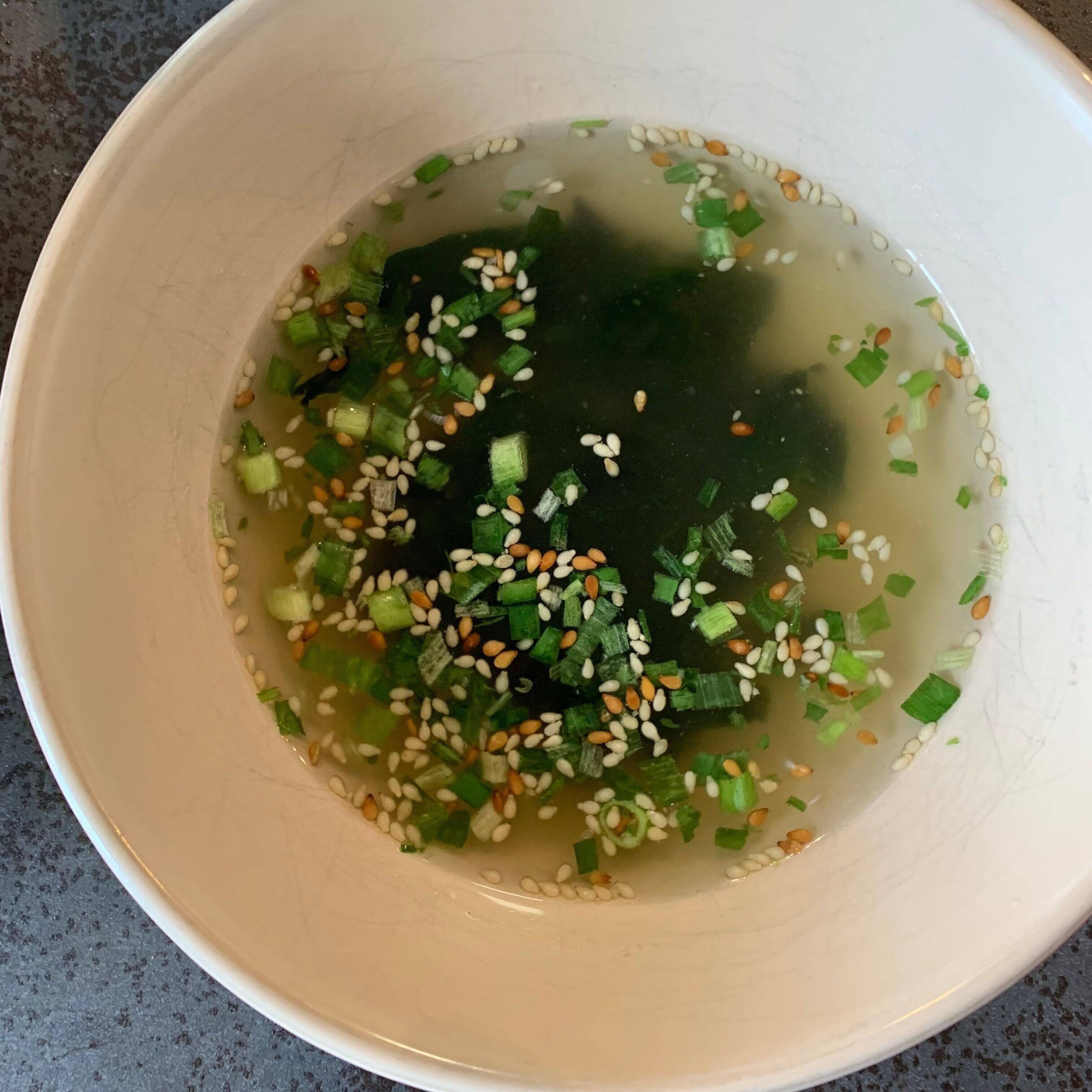 粉末スープとは思えぬほど、わかめ、ねぎ、ごまがたっぷりと入ったスープ!