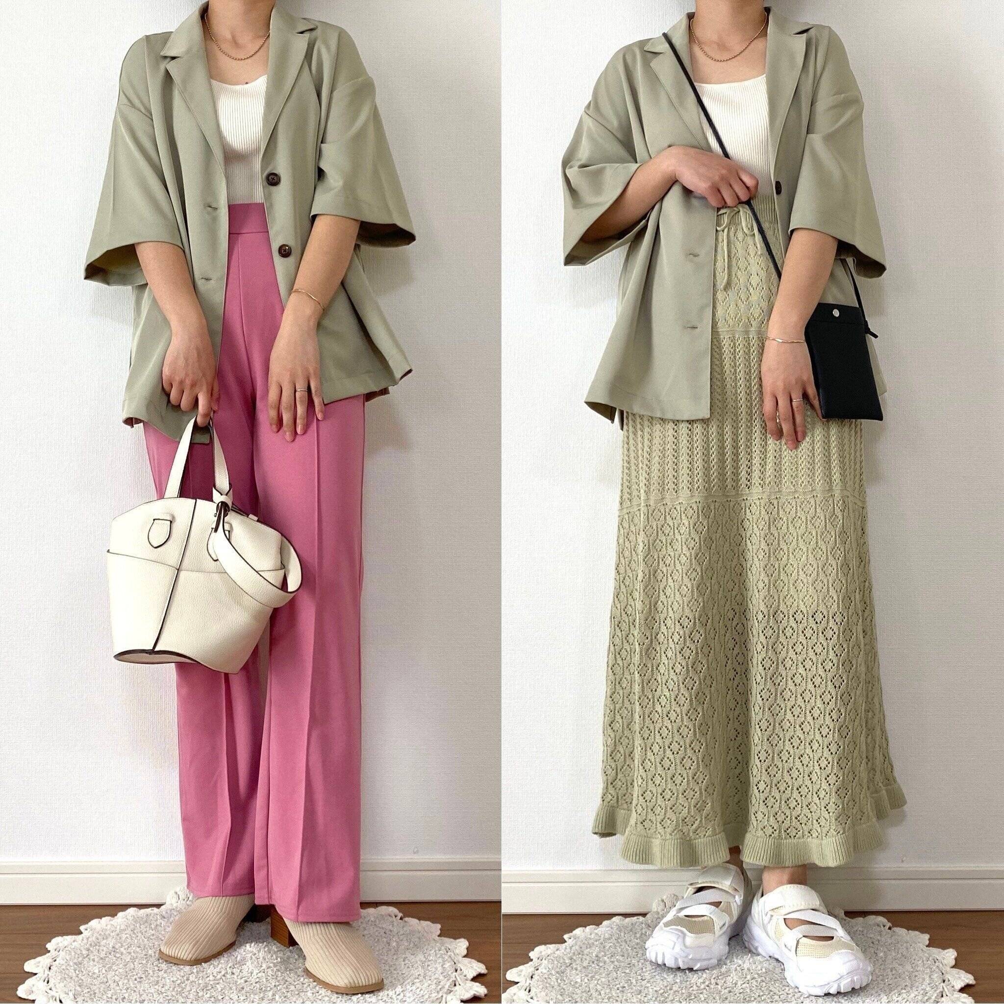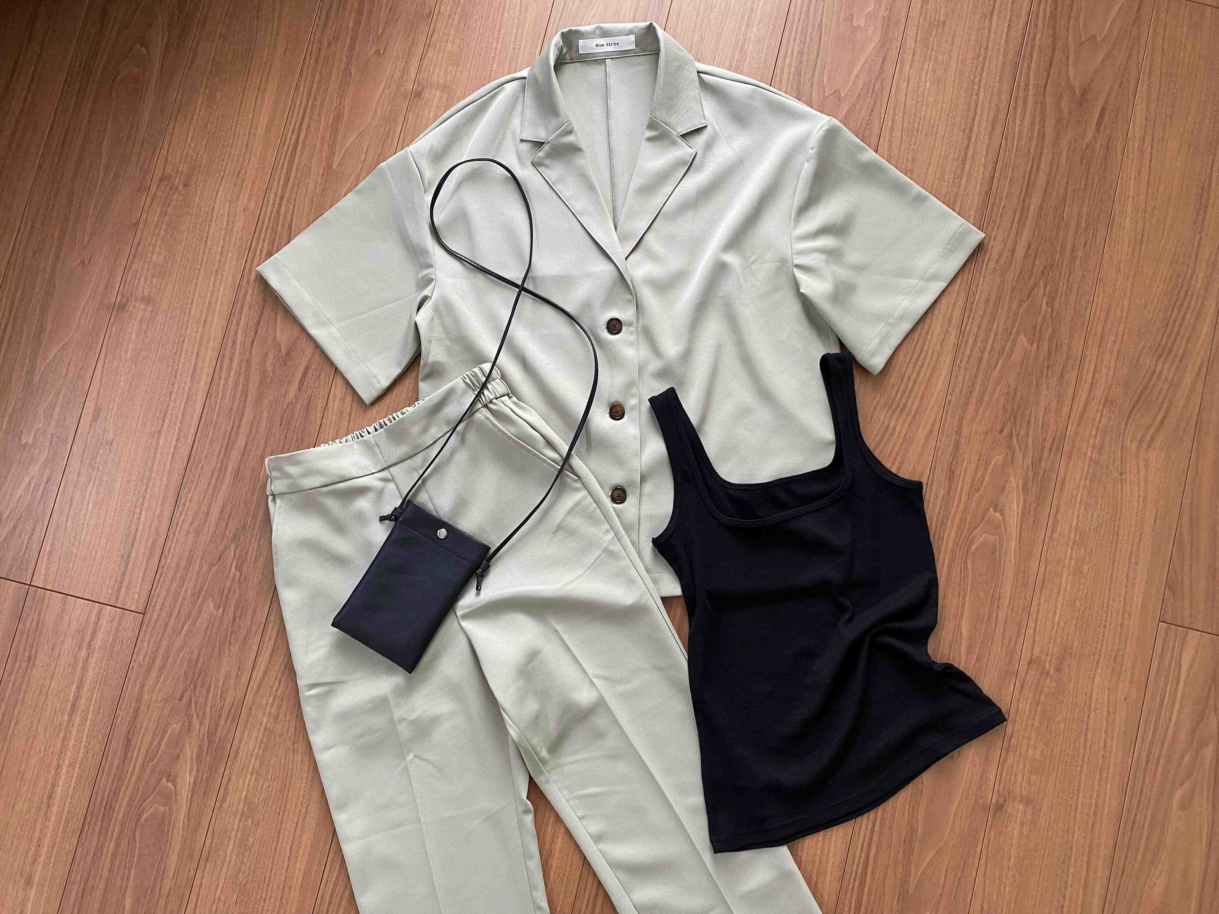 五分袖のジャケットとセンタープレスのパンツ、黒のタンクトップにショルダーバッグ。この4点セットがなんと2,200円です!