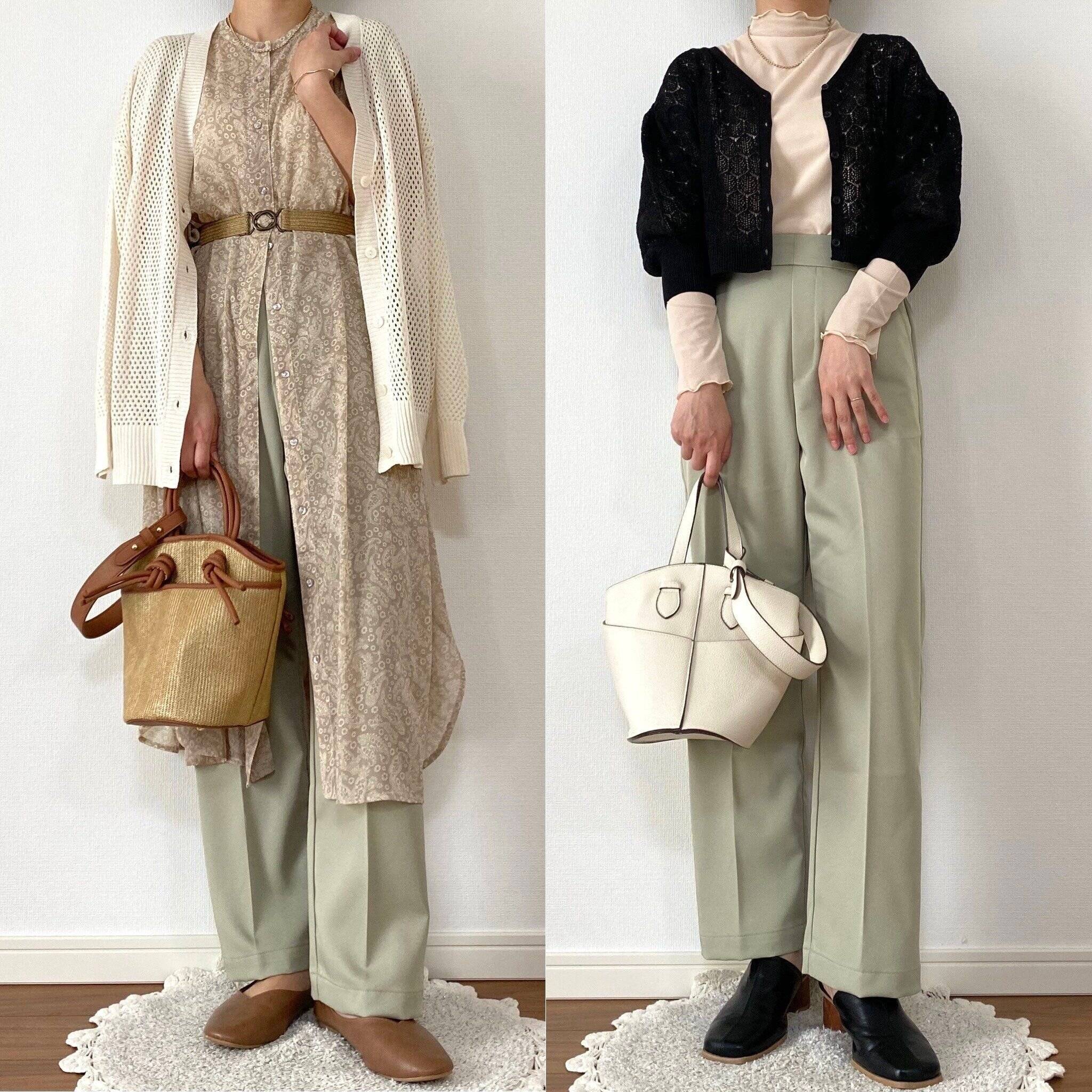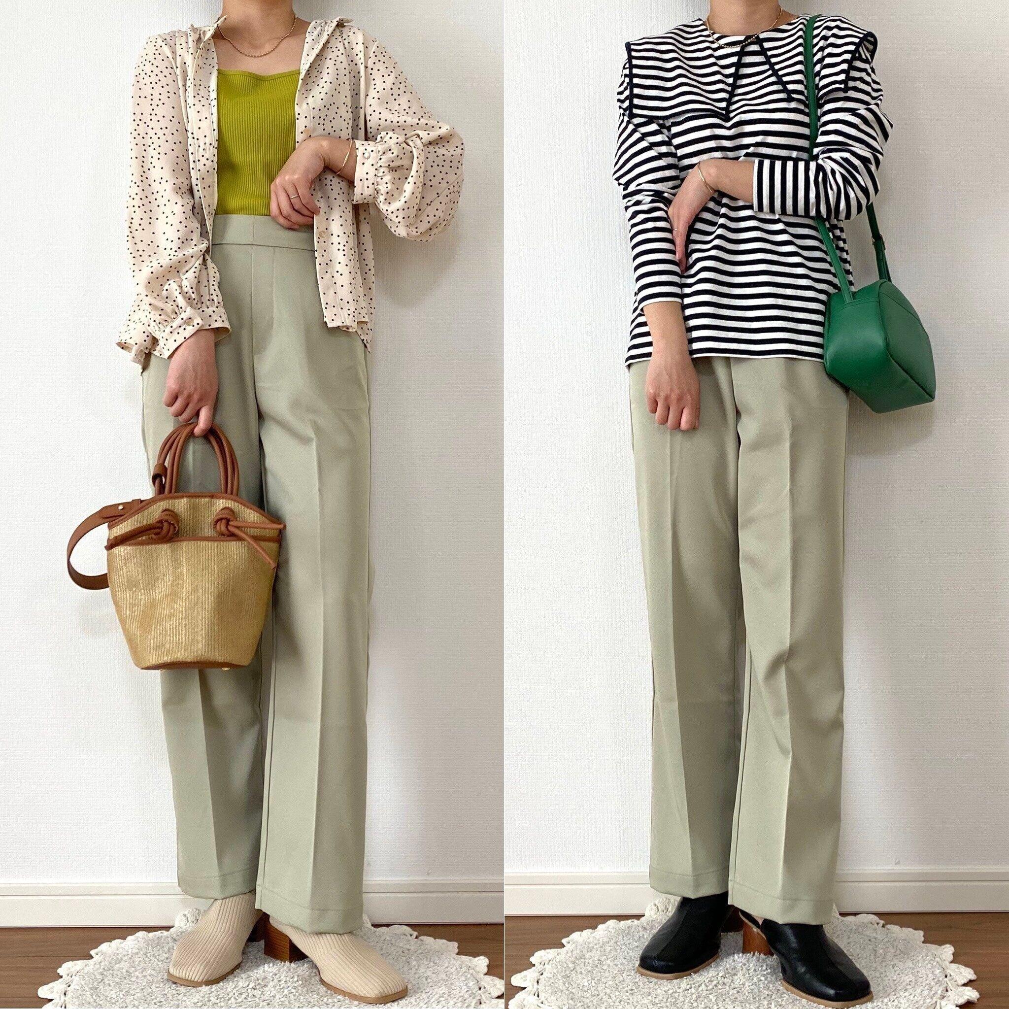 右は短丈トップスと合わせてセンタープレスの脚長効果を強調!