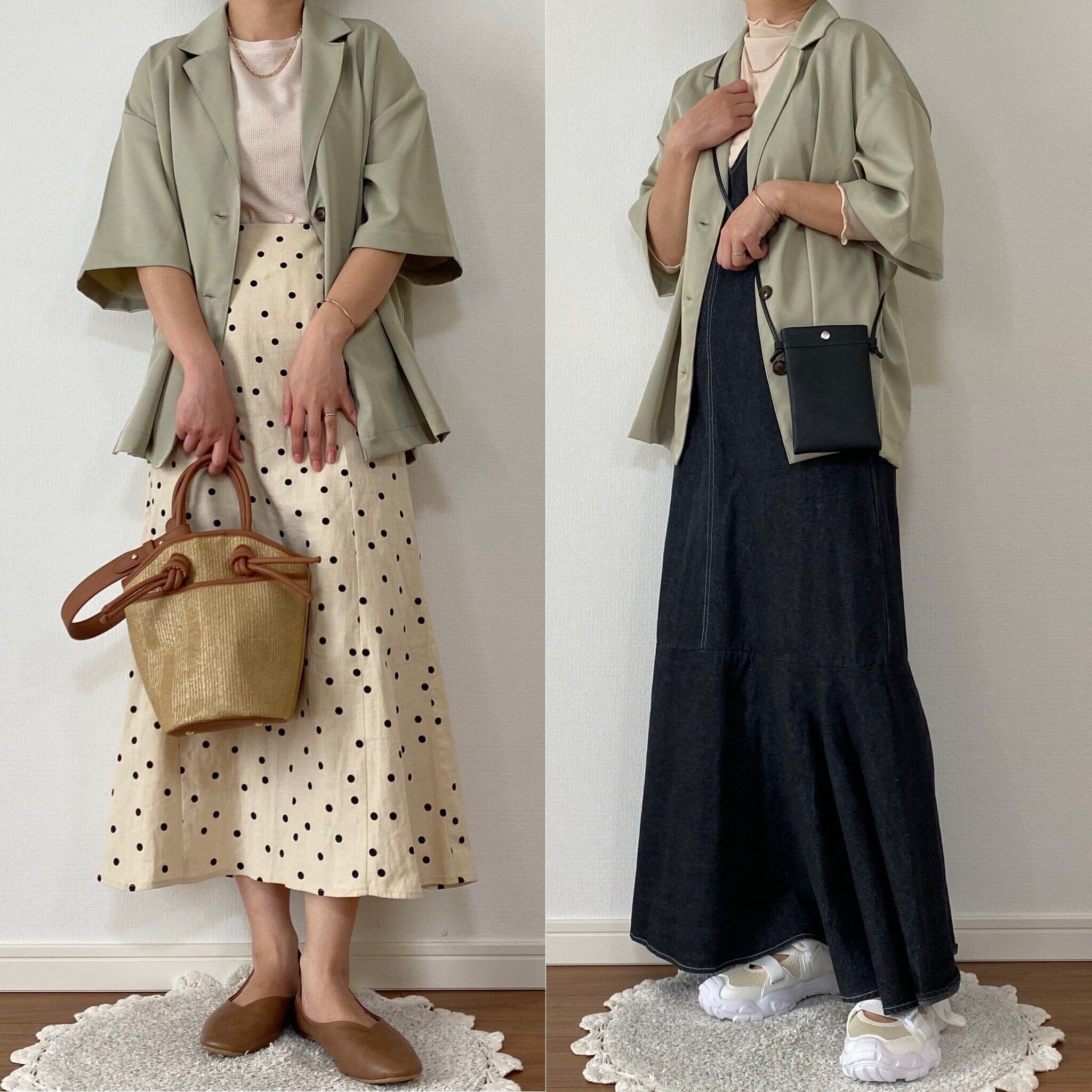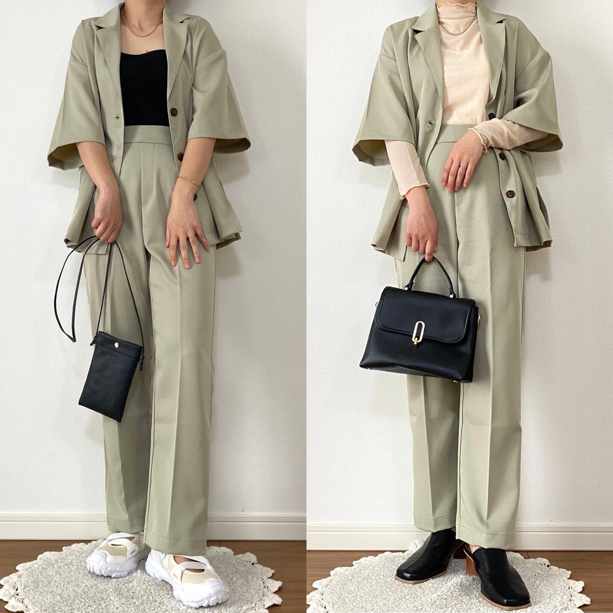 左はセットアイテムのトータルコーディネートをそのまま着用。