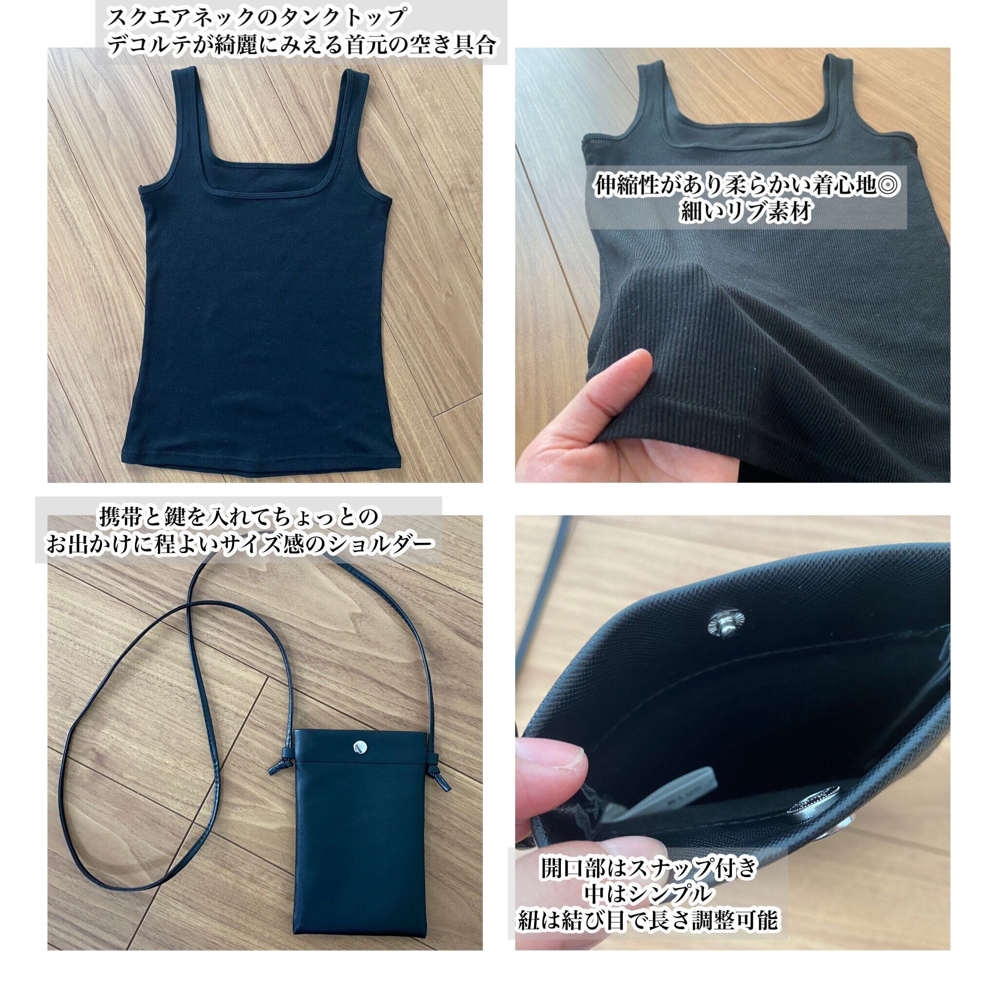 タンクトップもスクエアネックのデザインが今っぽく、伸縮性のある細いリブ素材で柔らかく着心地も良いです。シンプルな作りのショルダーはちょっとそこまでのおでかけにピッタリのサイズ。どちらもブラックで使い勝手抜群!
