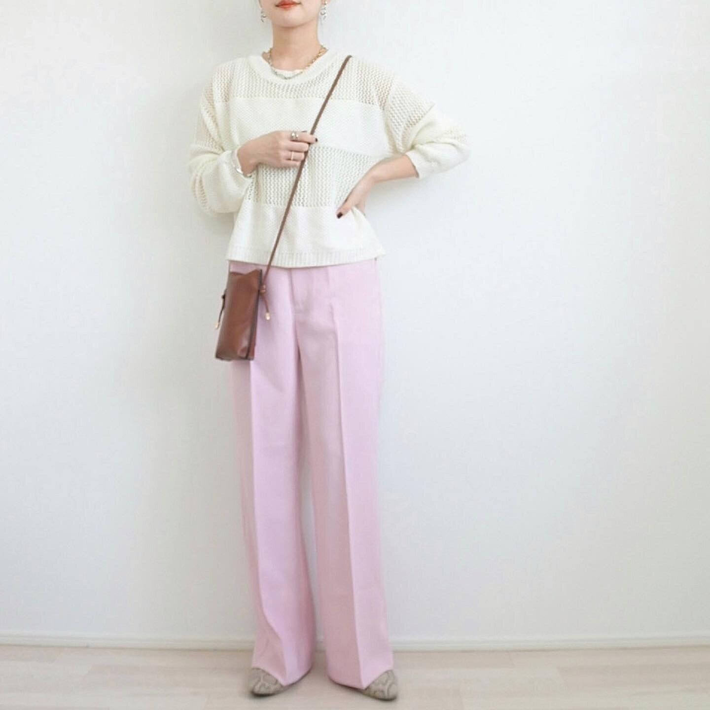 白のメッシュニットと合わせて優しい色合いの今年らしいスタイリングに。小物をブラウン系、ベージュ系にする事でより優しい印象になります。