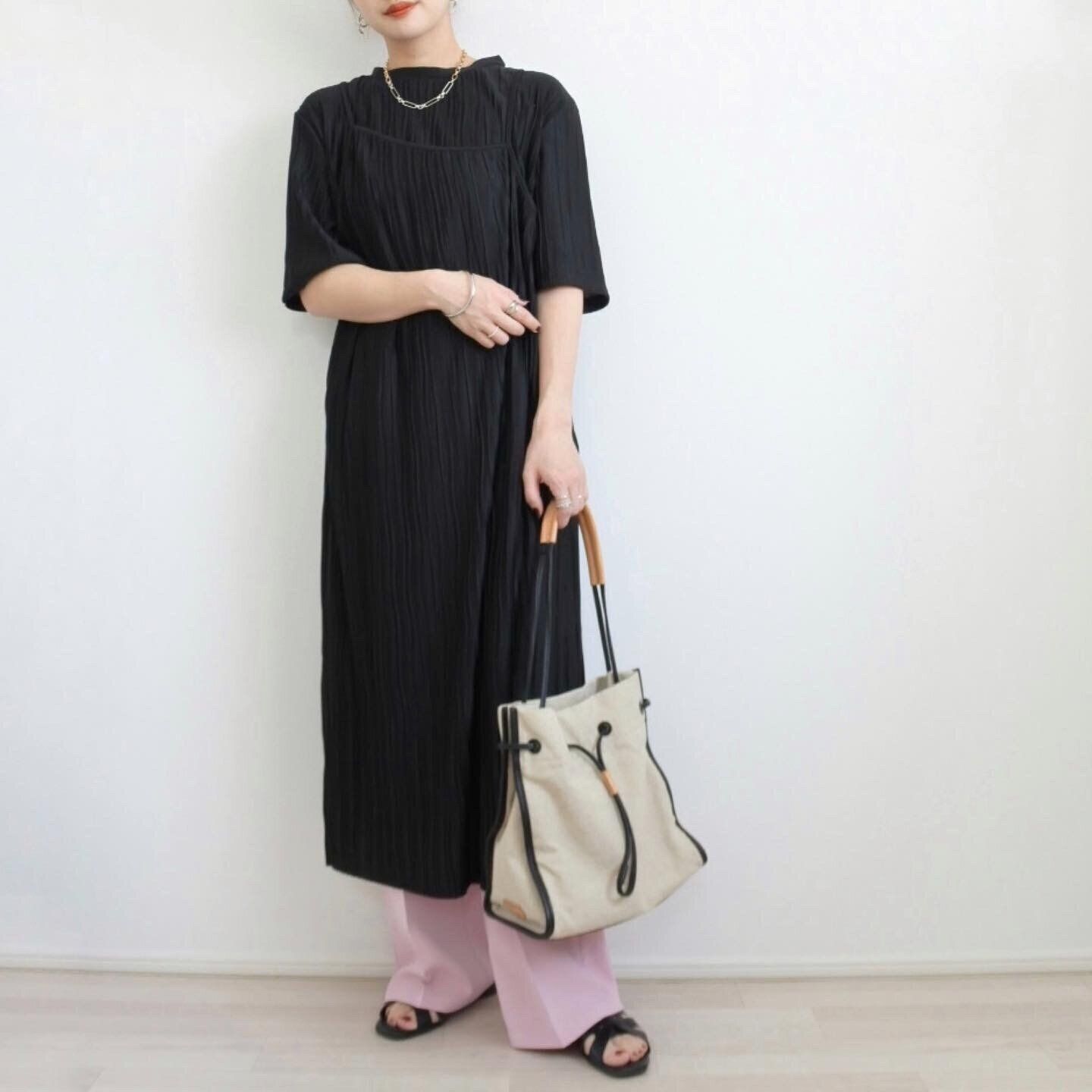 ピンク×ブラックで一気に大人な雰囲気に。ピンクアイテムは挑戦したいけどさりげなくがいい、という方はぜひワンピースとのレイヤードコーデがおすすめです。