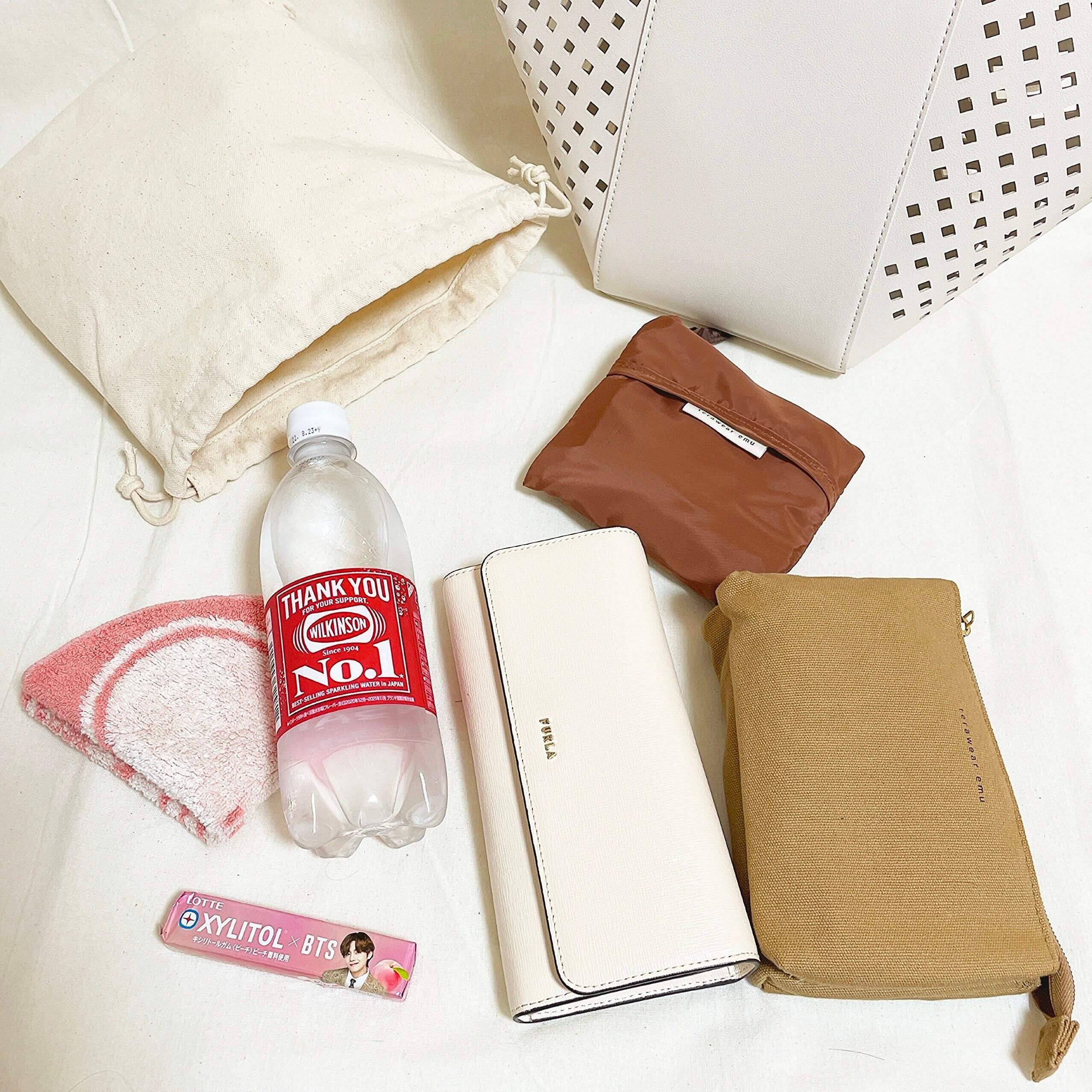 こちらのバッグにも巾着が付属されていますが、すっぽりと横に長財布を入れることができました!他にもポーチやペットボトルなども入れられたので、このカバンひとつで多くの荷物を持ち運びできそうです。