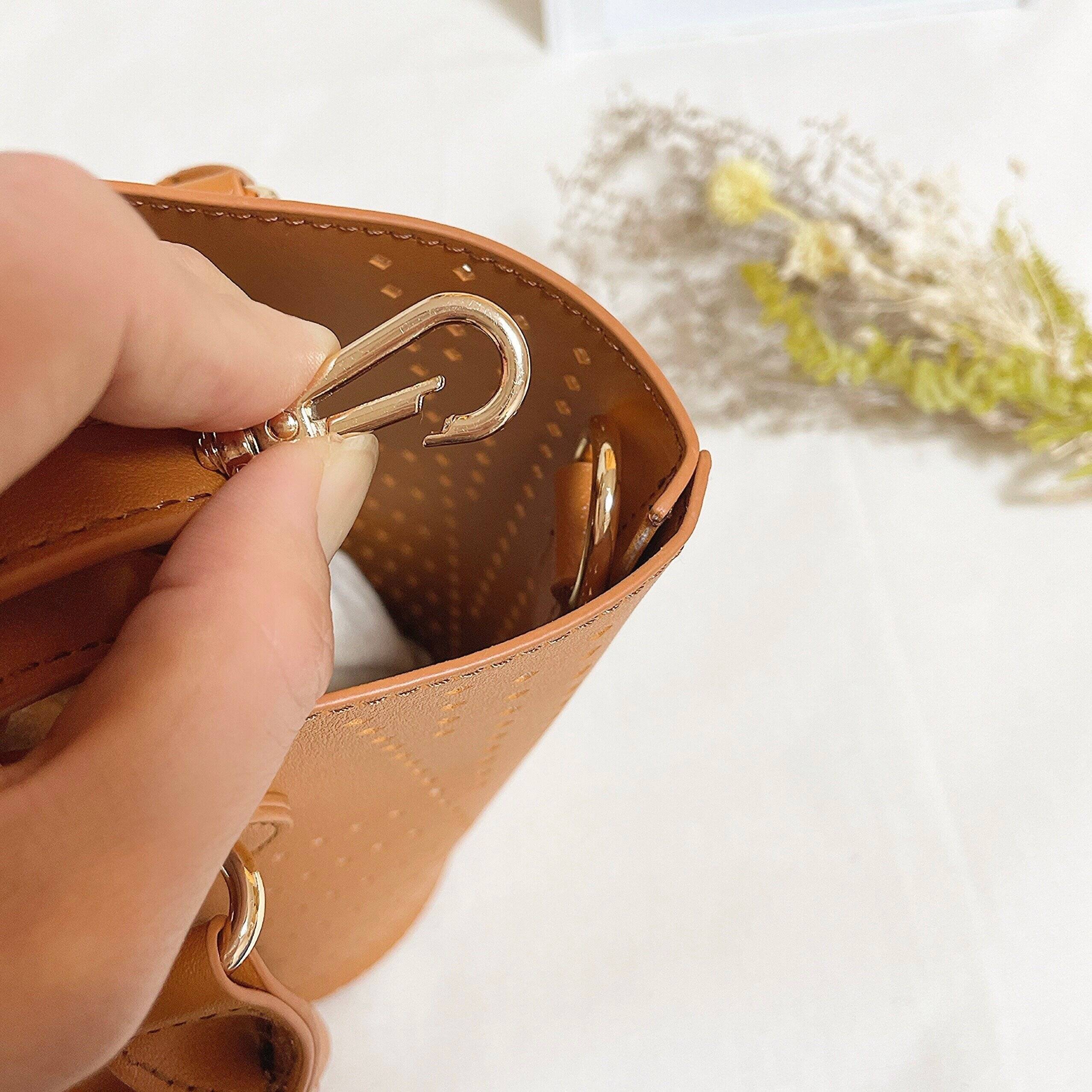 オレンジに近い中茶に惹かれ購入しました。中身が見えにくい、ひし形の小さなパンチングが特徴的。ころんとしたシルエットが女性らしさを感じさせます。