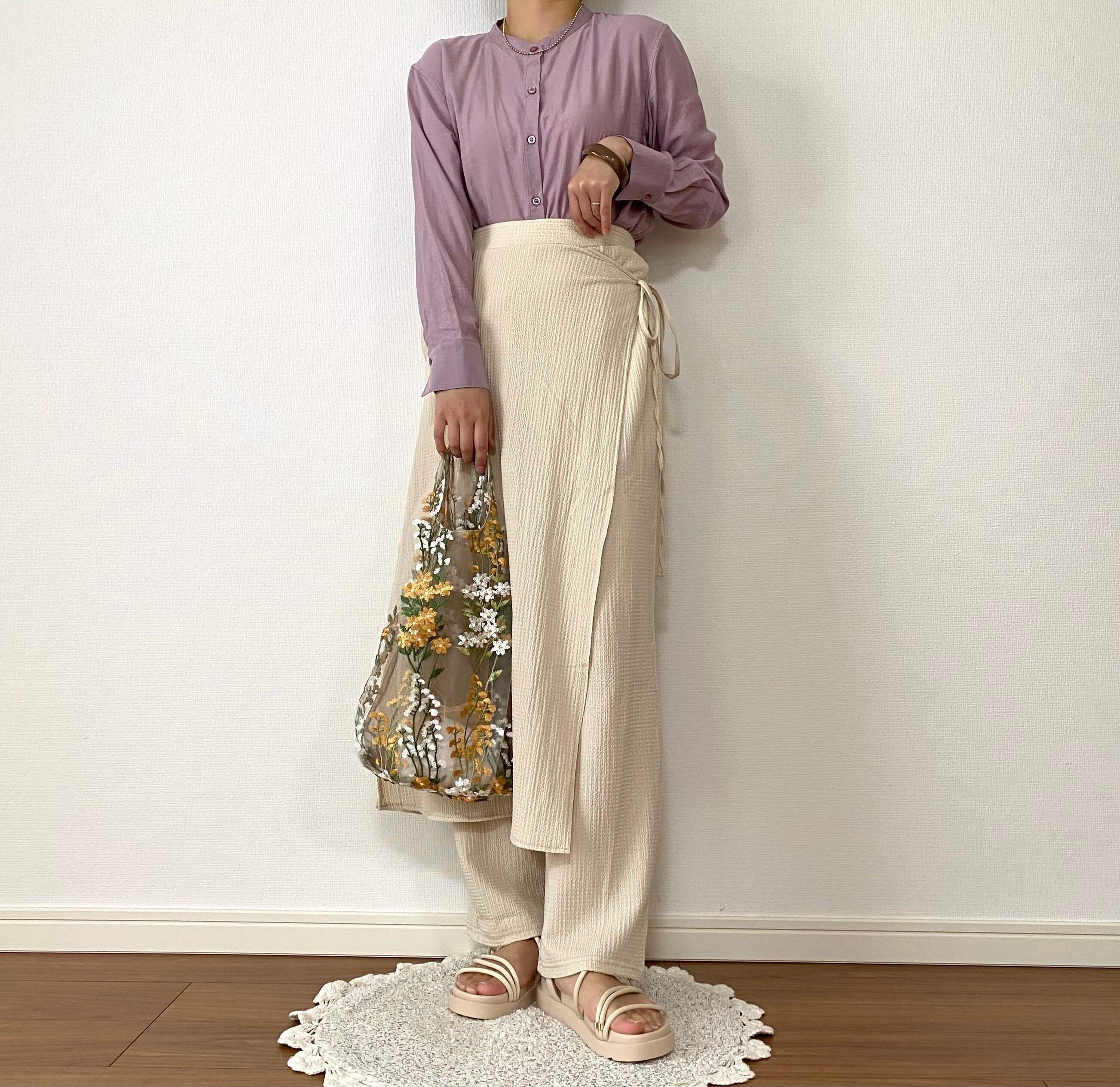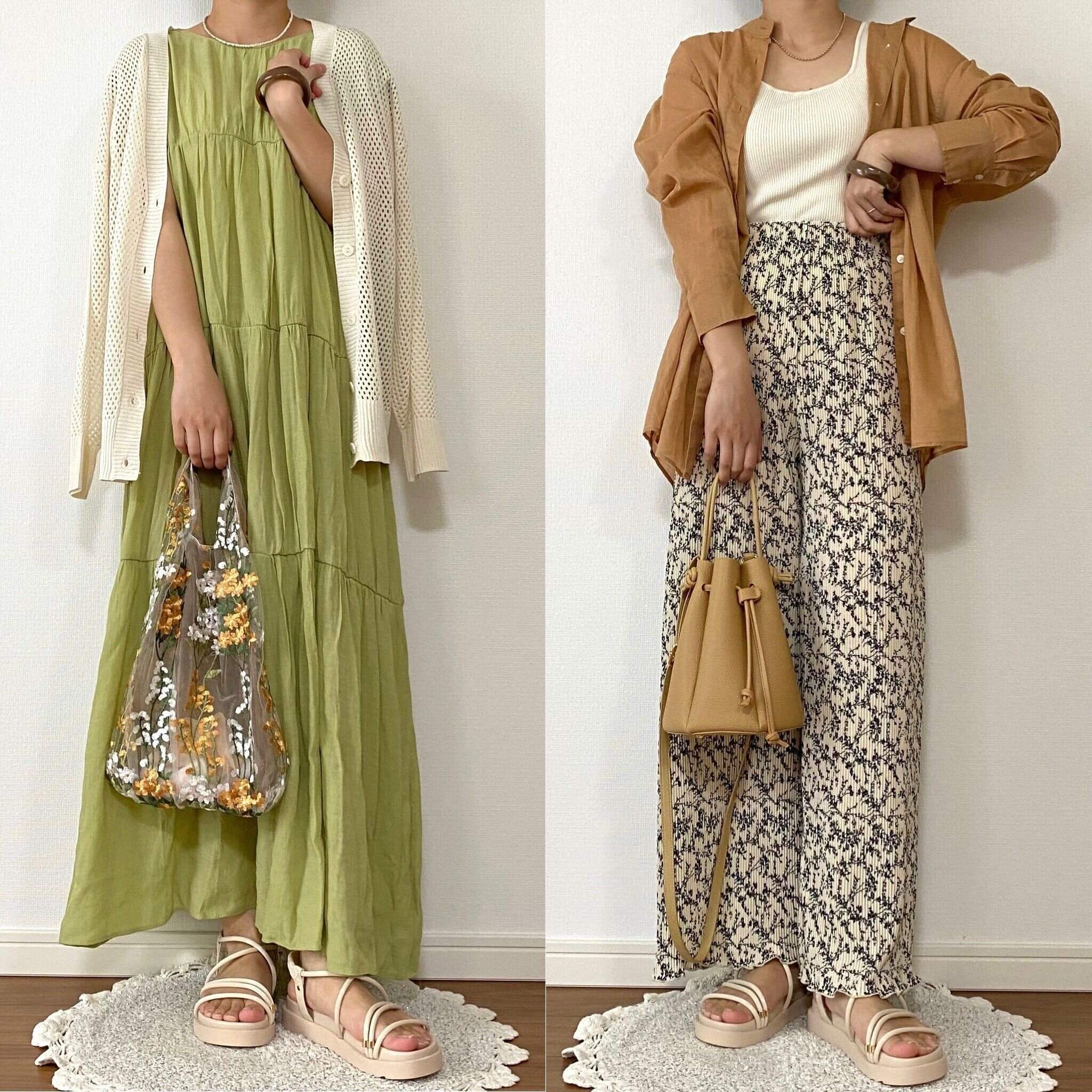 ティアードワンピースと花柄のプリーツパンツのリラックススタイルに合わせてみました。