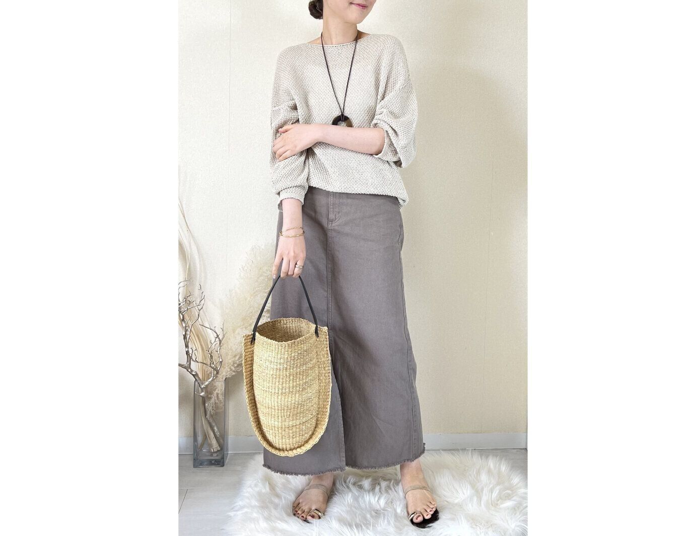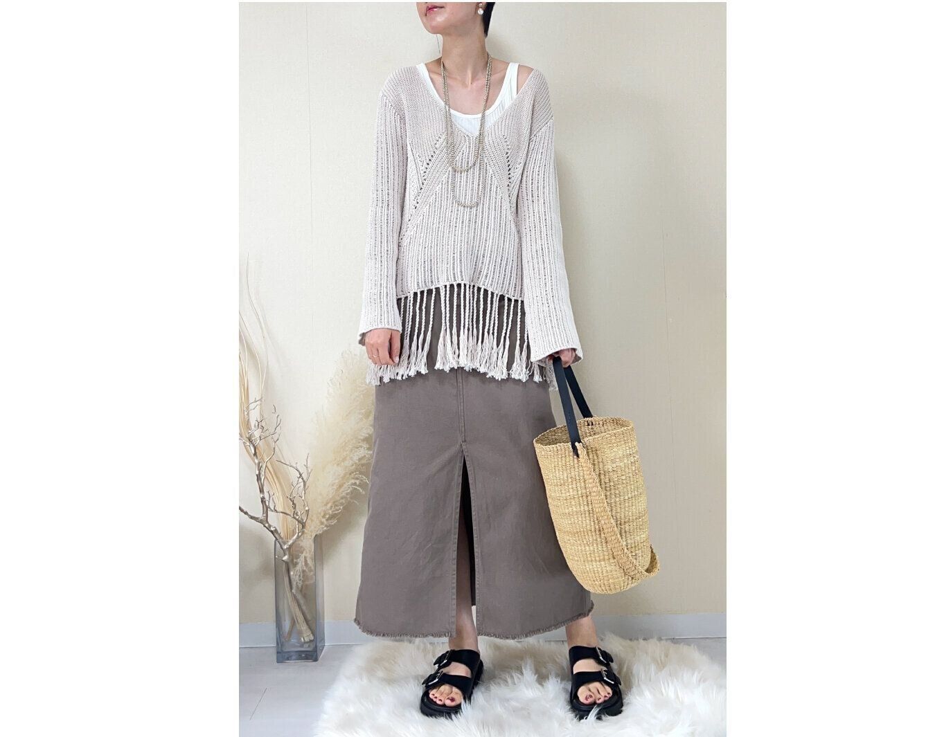 夏はカゴバッグをあわせると清涼感を演出できます。