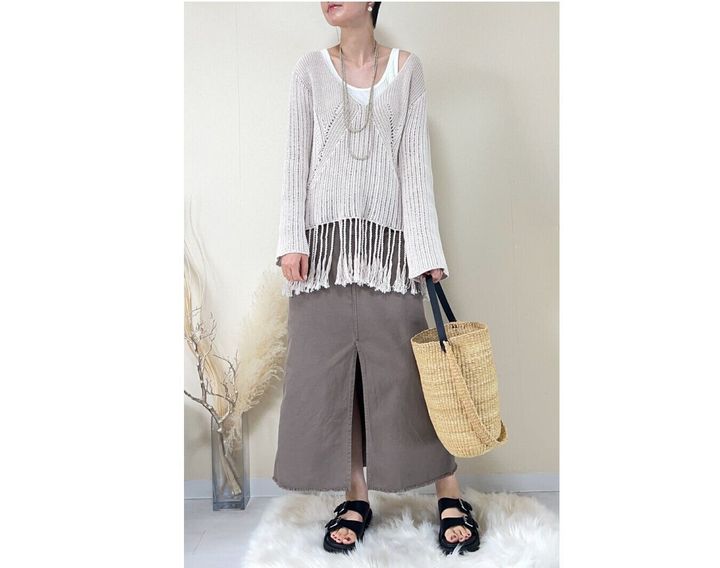 こちらも今年流行のシアーニットをあわせて大人の抜け感カジュアルコーデに。