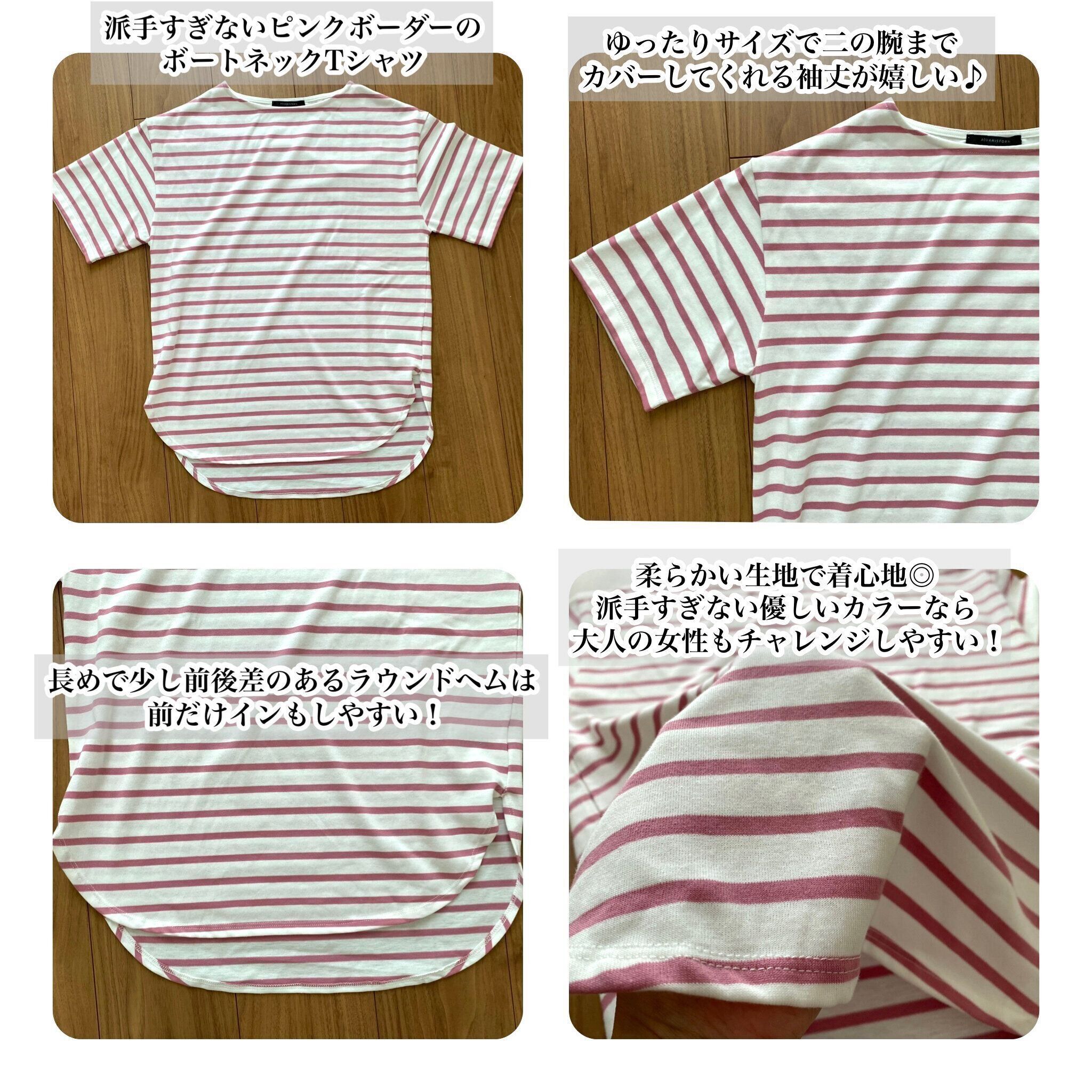 派手すぎない優しいピンクカラーのボーダーTシャツです。