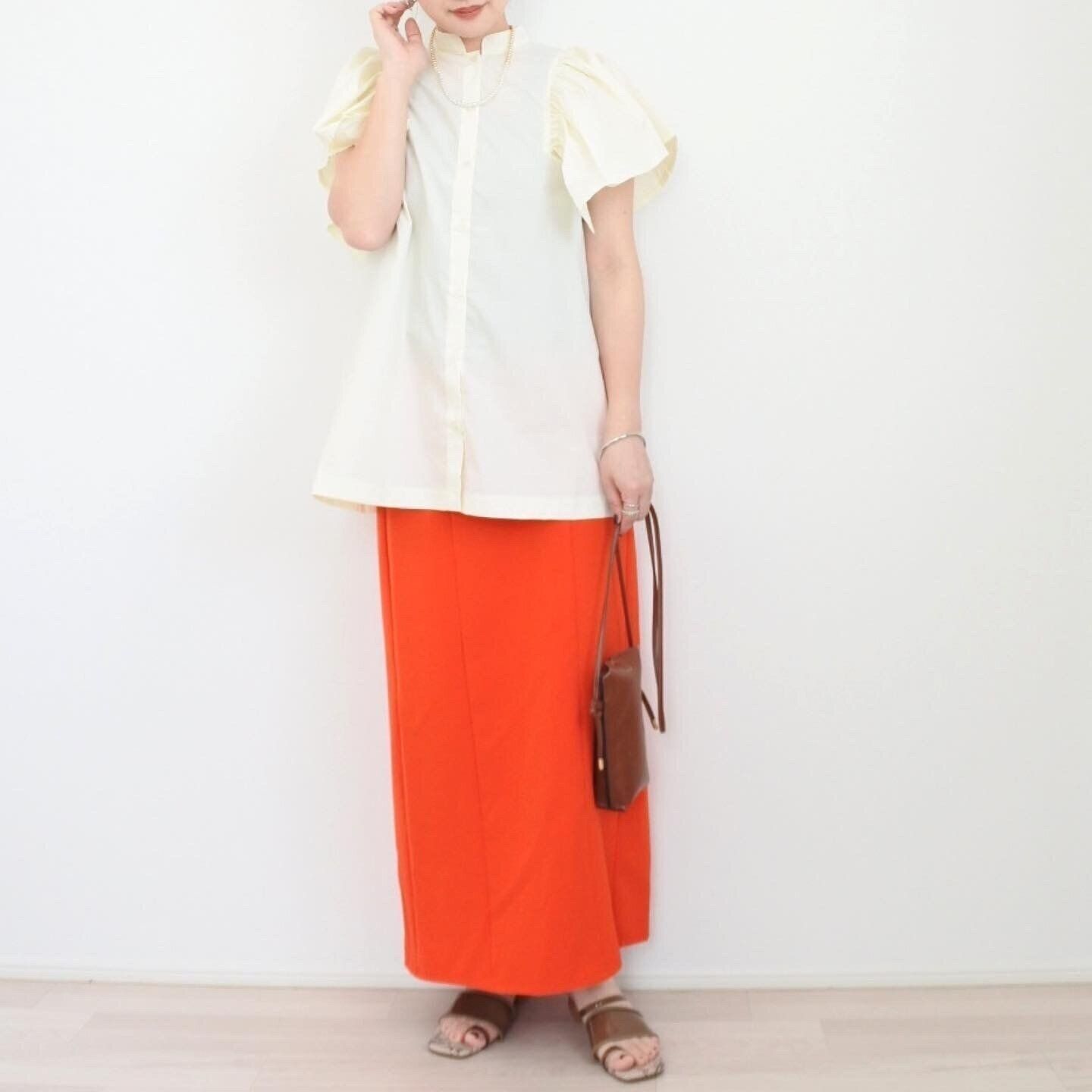 夏らしい素材感のタイトスカートと合わせたスタイリングです。
