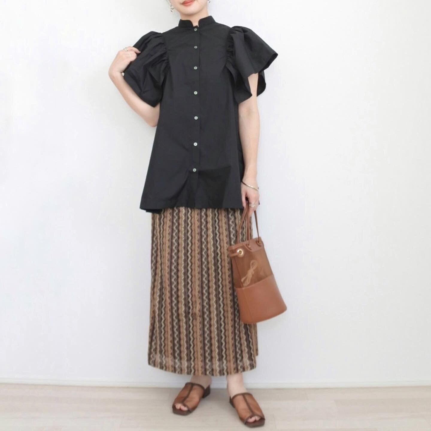 肩フリルがふんわり広がっているのでボトムスはタイトめなものと合わせると全体が締まります。