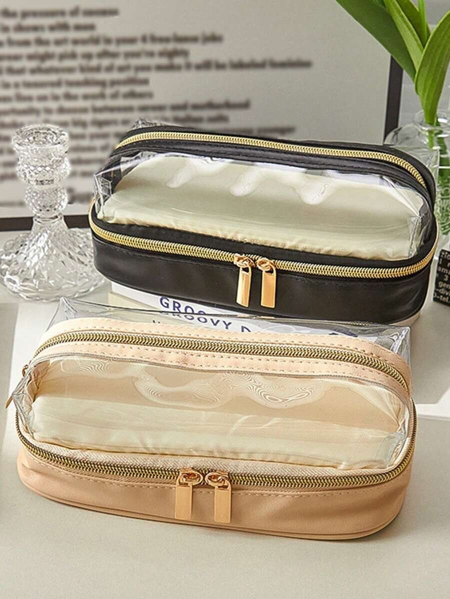 2層式で仕分けが出来る大きめサイズの筆箱です。ファスナーが大きく開くため、取り出しやすい設計になっています。上下分けられるため、化粧ポーチとしても使えて便利です。