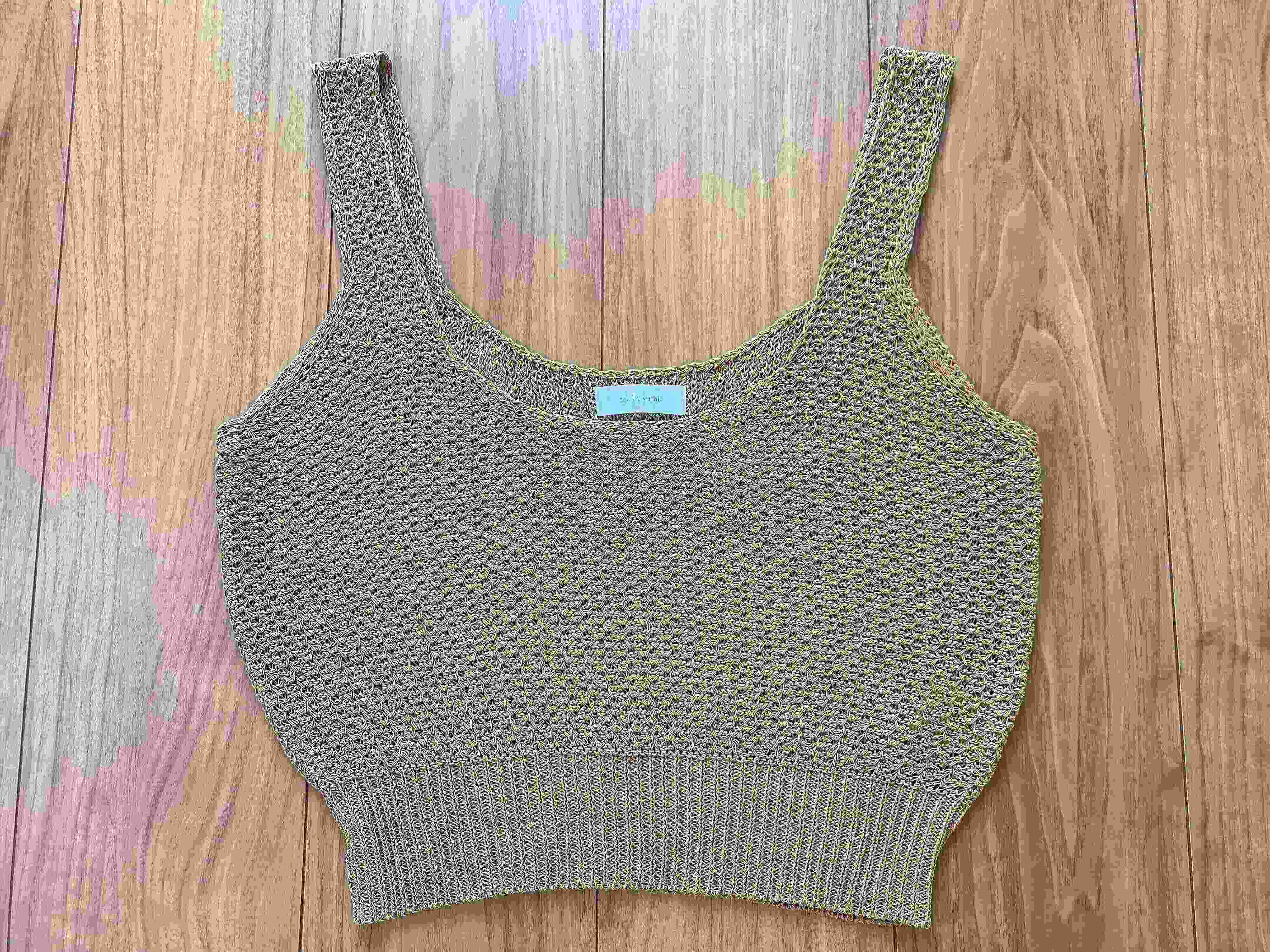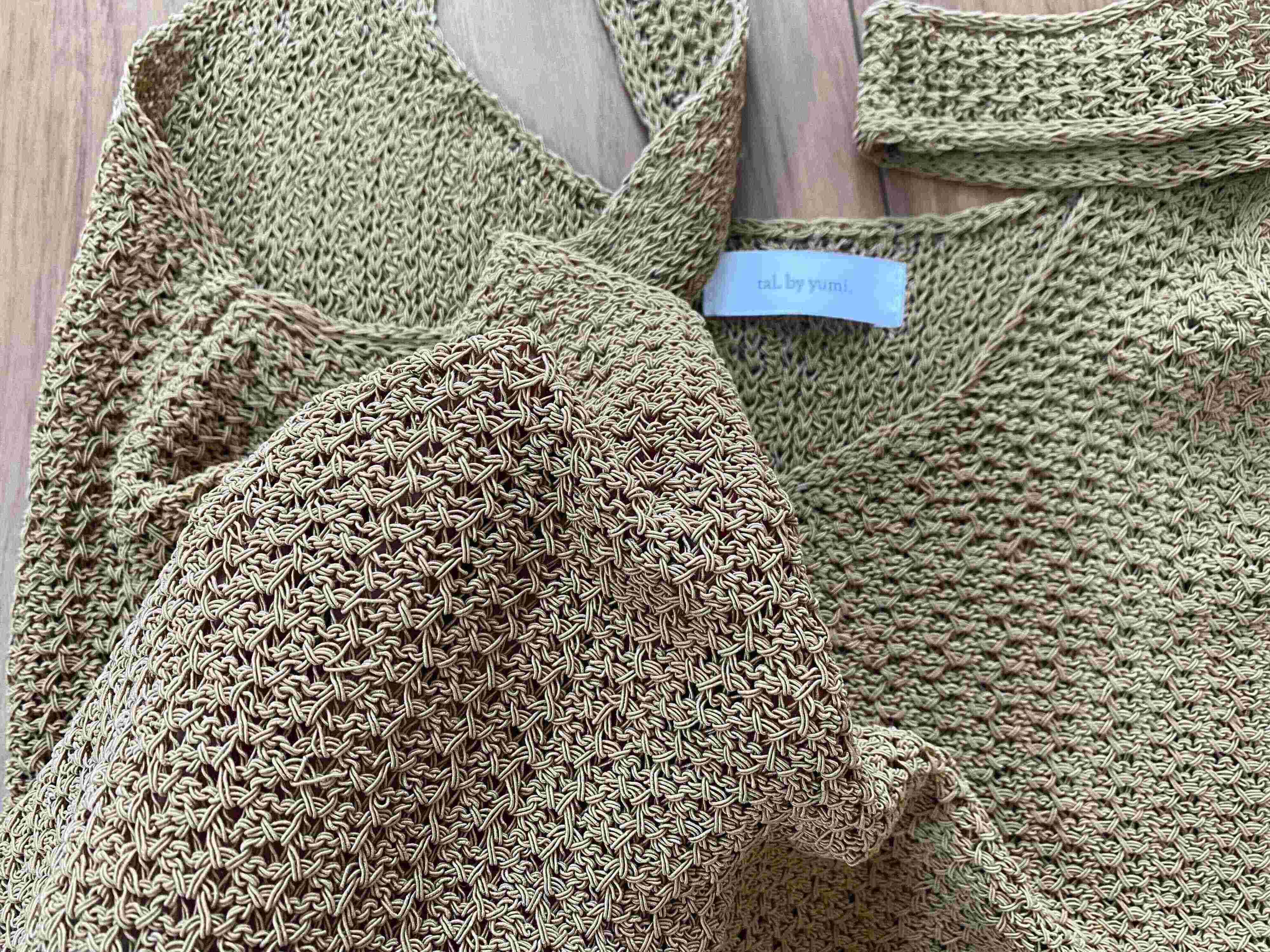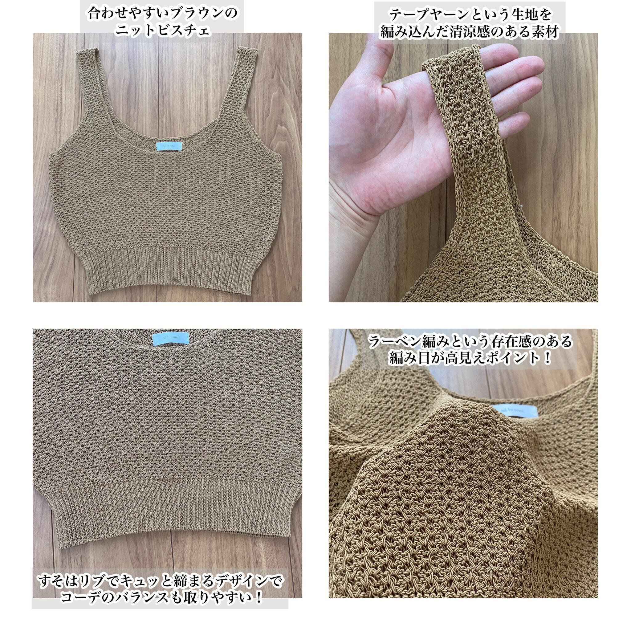 テープヤーンという紐状の生地を編み込んでいる涼しげな素材なので、ニットビスチェですが真夏のレイヤードもストレスなく楽しめそうです。