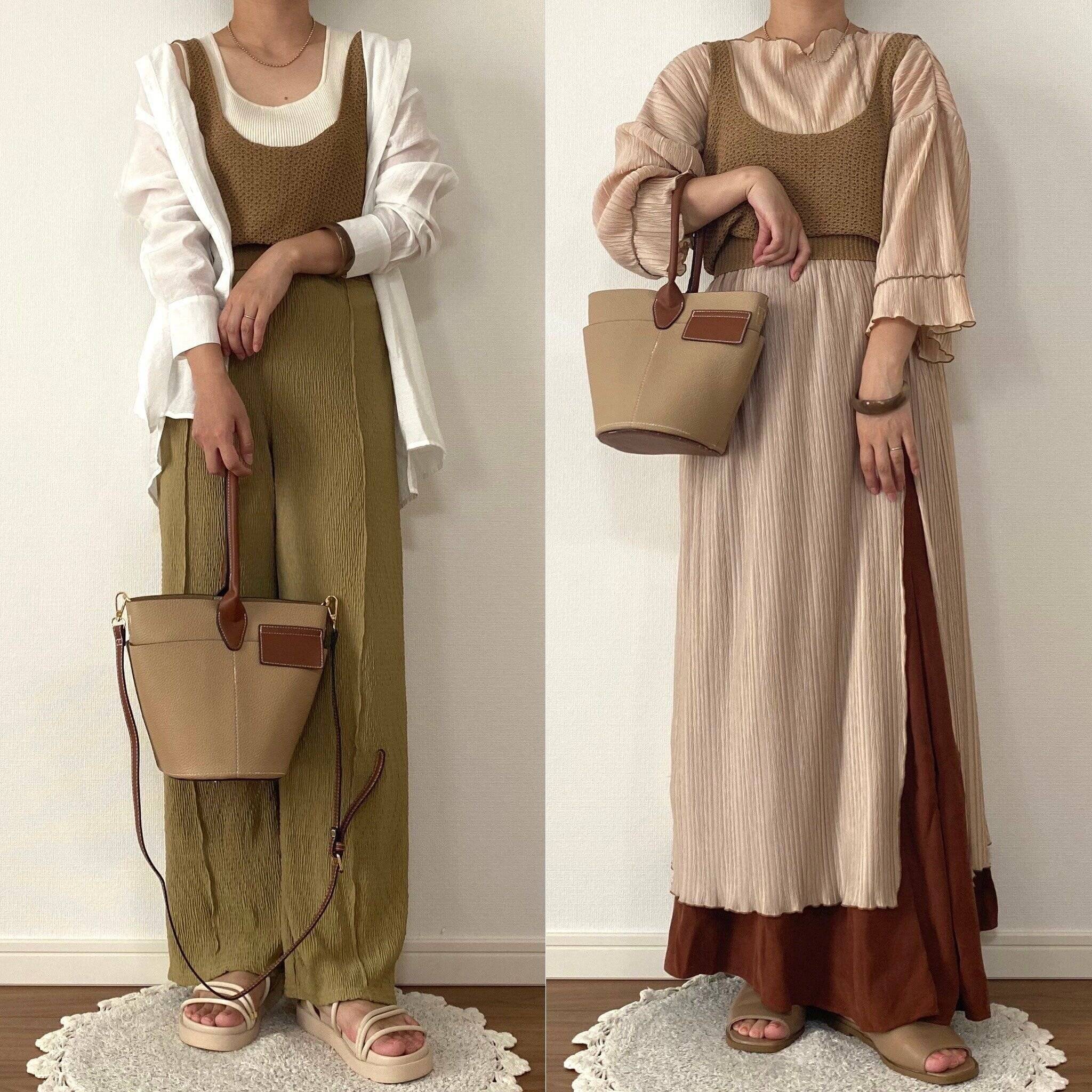 右は全体的にゆるっとしたシルエットのコーデにビスチェを合わせてメリハリを。