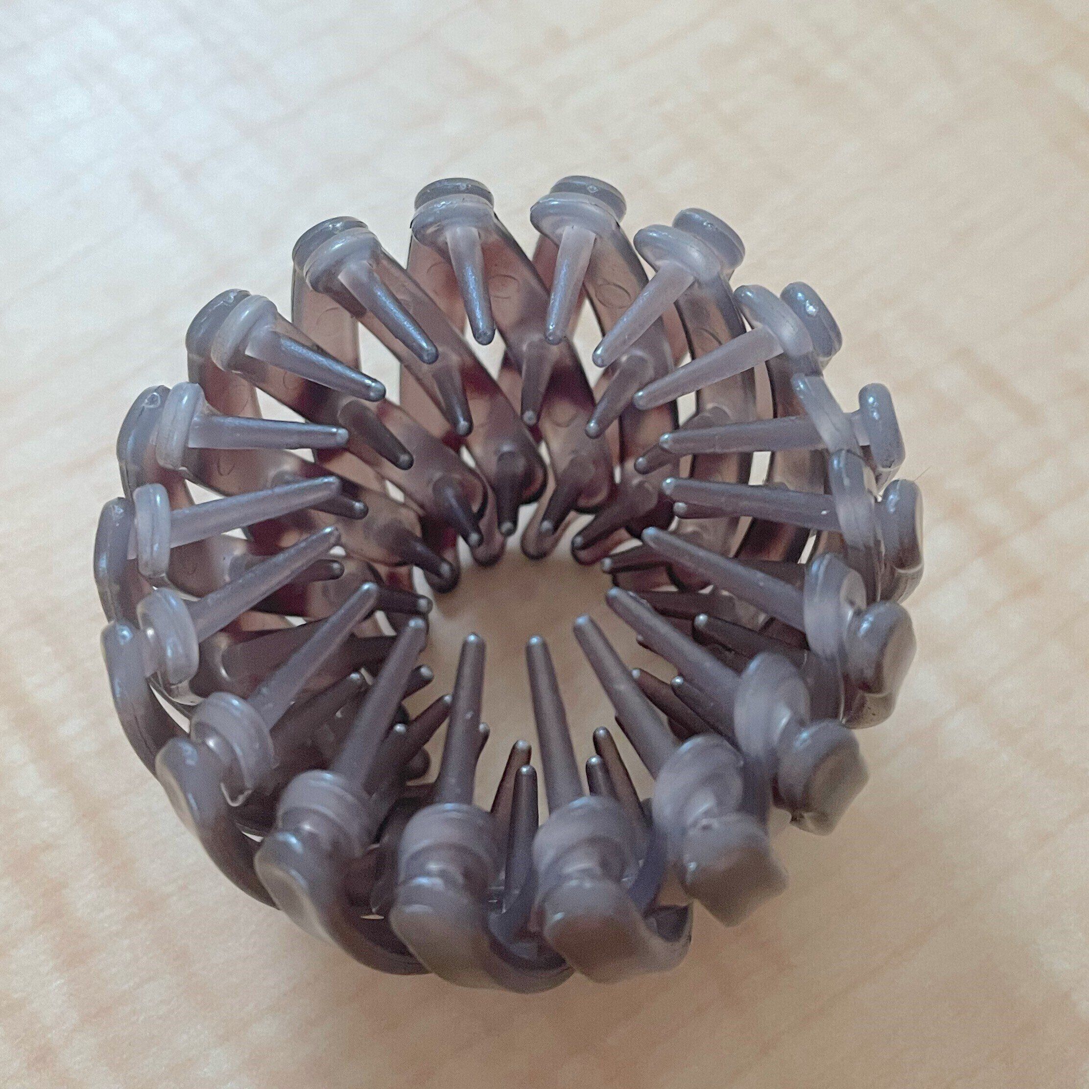 中心から外側へ手で広げるとクロスした本体が広がり中心の円が大きくなります。中の突起は約1cmほどの長さ。クロスした棒のような部分に3段になって付いています。