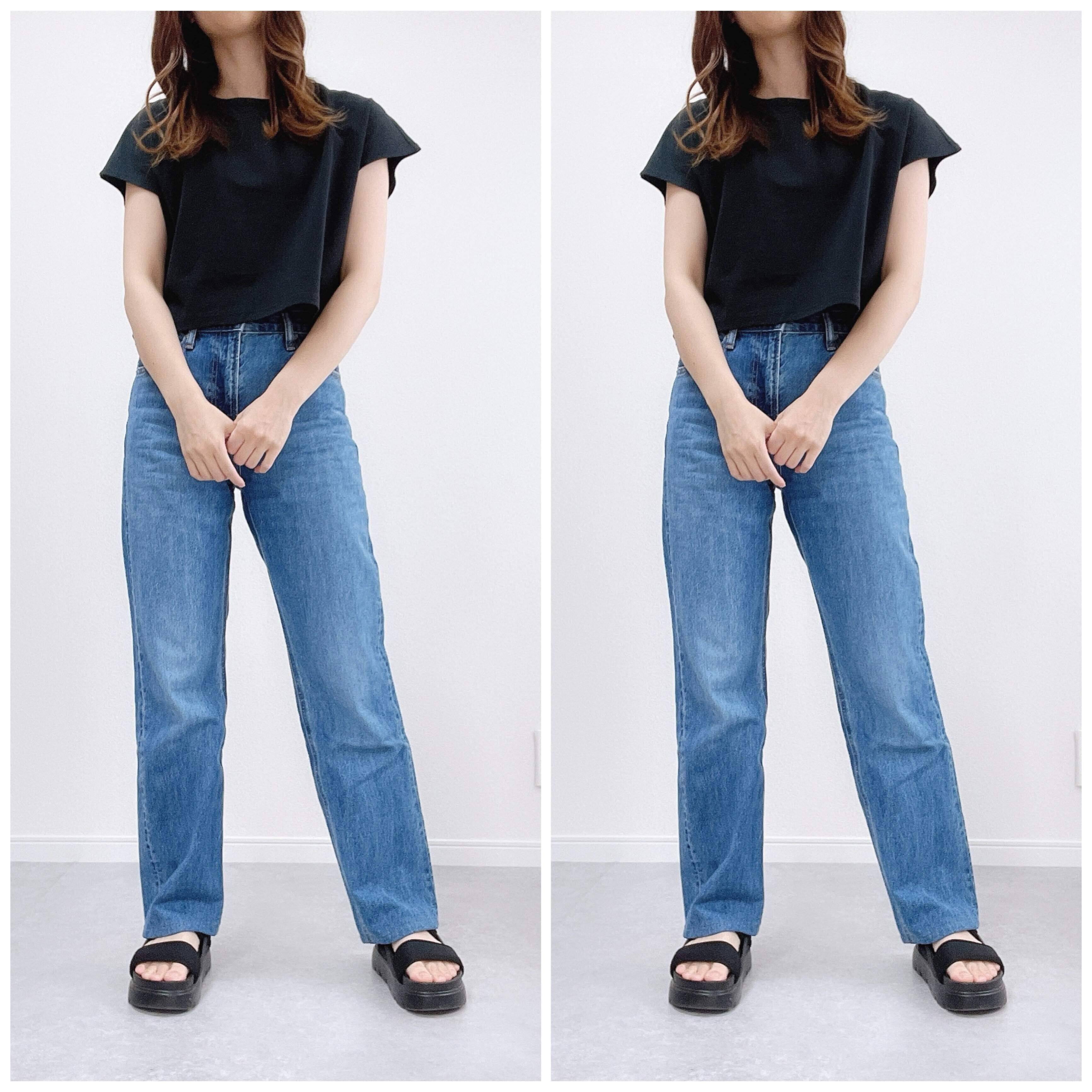 最後はTシャツだけで着てみました。最近流行りのクロップド丈です。丈が短めなので画像のようなハイウエストのボトムと相性が良いですね。