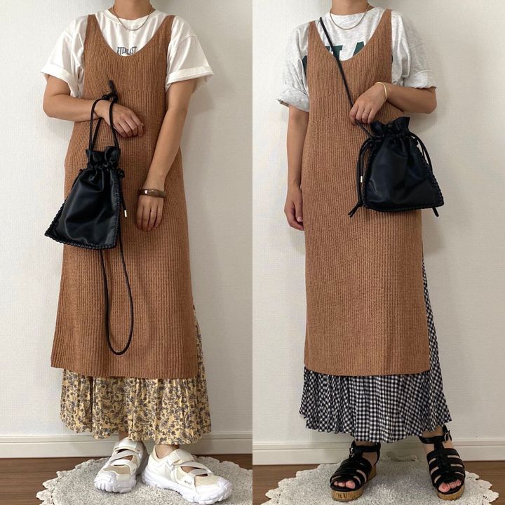 チラリと覗くTシャツのロゴやスカートの柄が、レイヤードするアイテム次第でそれぞれ違った雰囲気に見せてくれます。