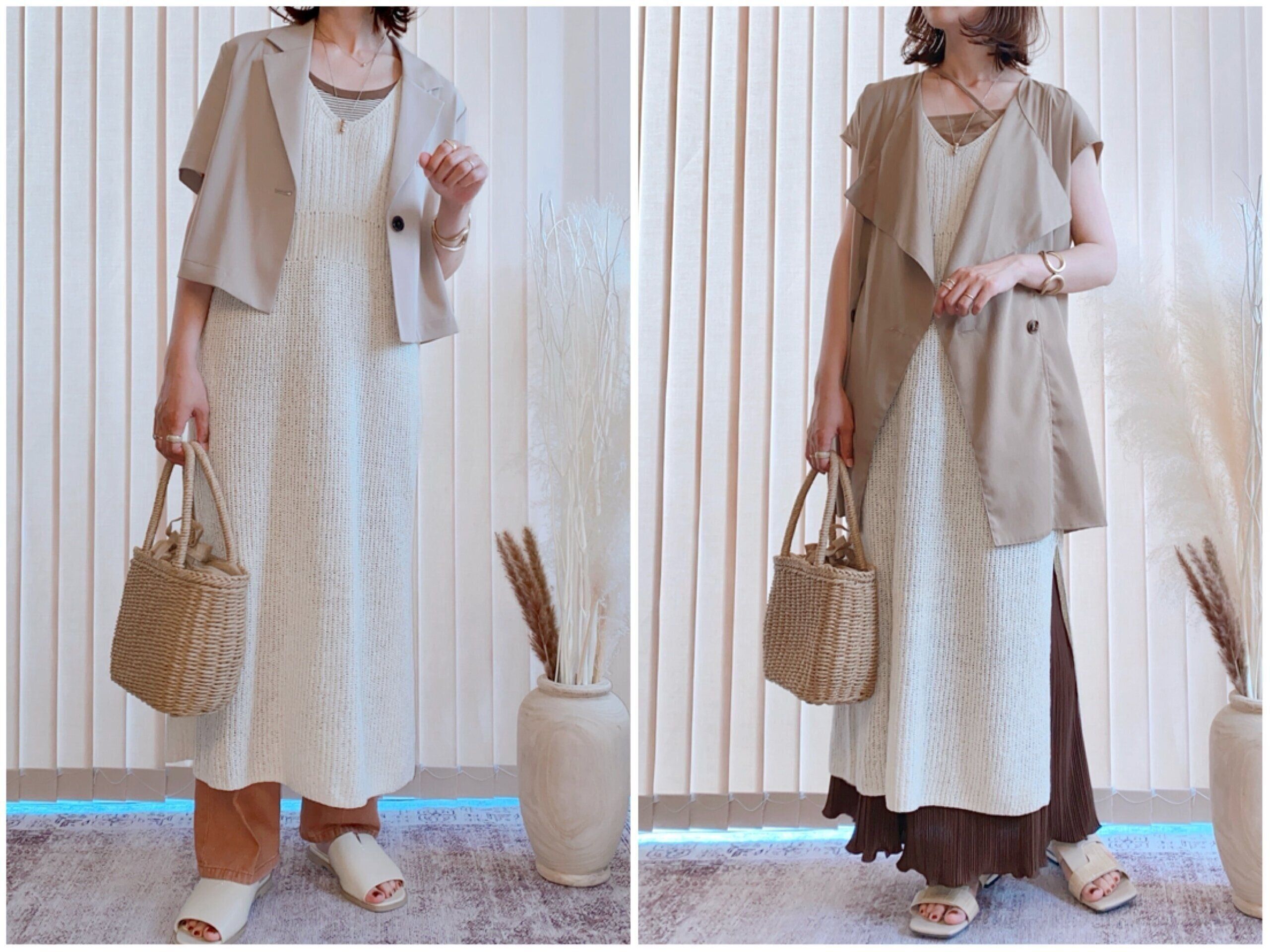 キャミソールやタンクトップにワンピだけだと少し露出しすぎかな?と気になる時は、ジレや半袖ジャケットで肩や二の腕をカバー。きちんと感や大人っぽさもプラスされてこなれた印象で着られます。