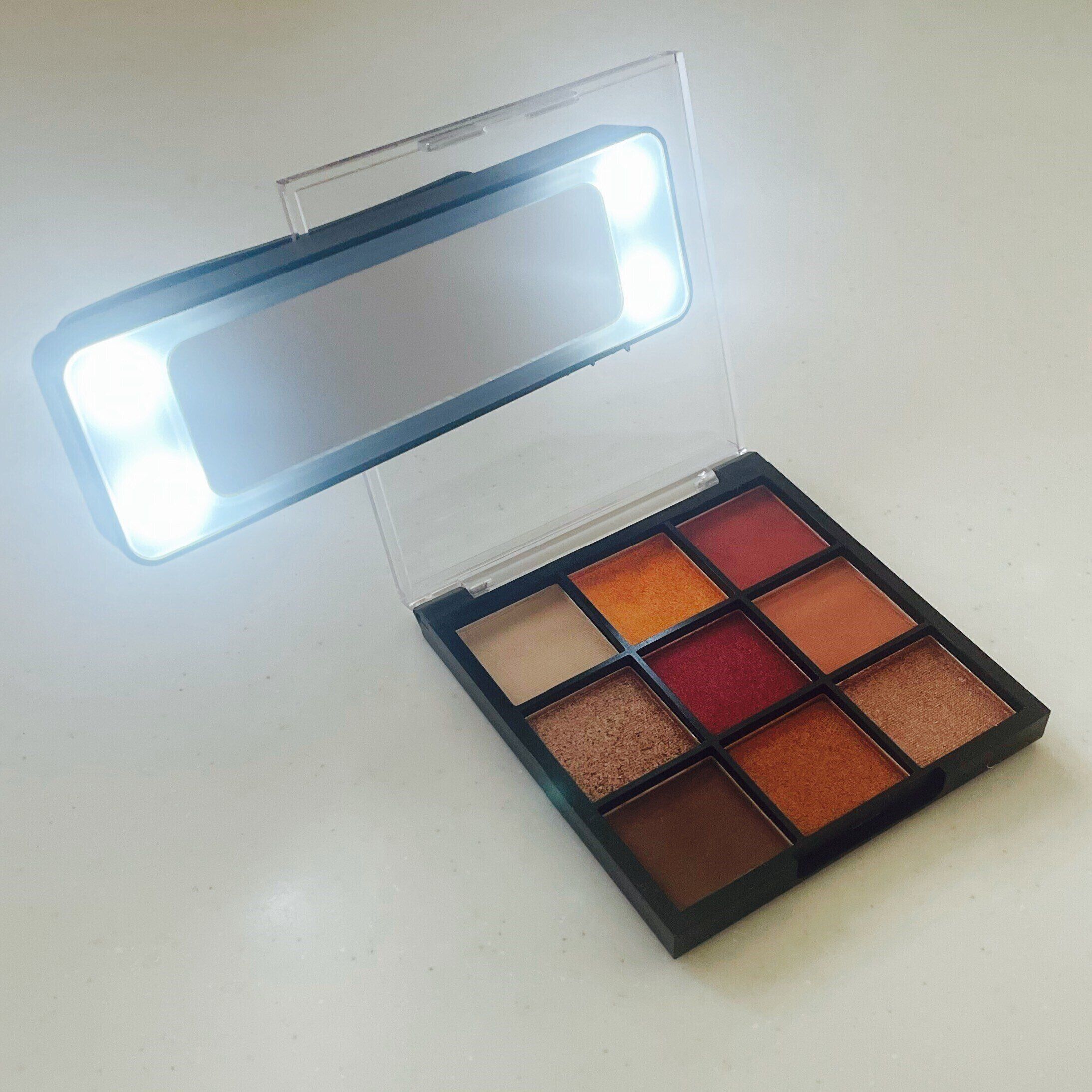 ボタン電池をセットしてネジをしっかりしめた後、ミラーのないメイクパレットの蓋部分にクリップを使って商品を挟み本体のサイドにあるスライドスイッチをONにすると…