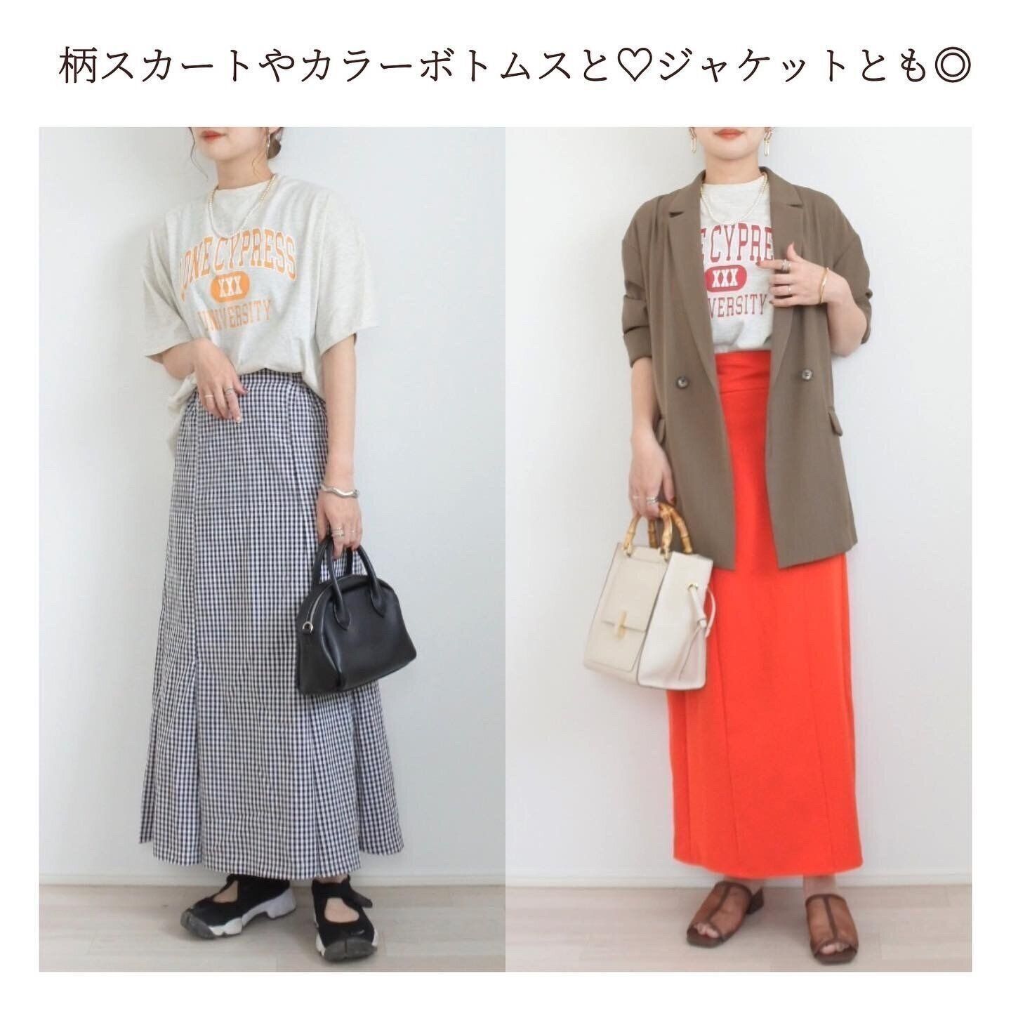 柄スカートやカラースカートとも相性がいいですね。