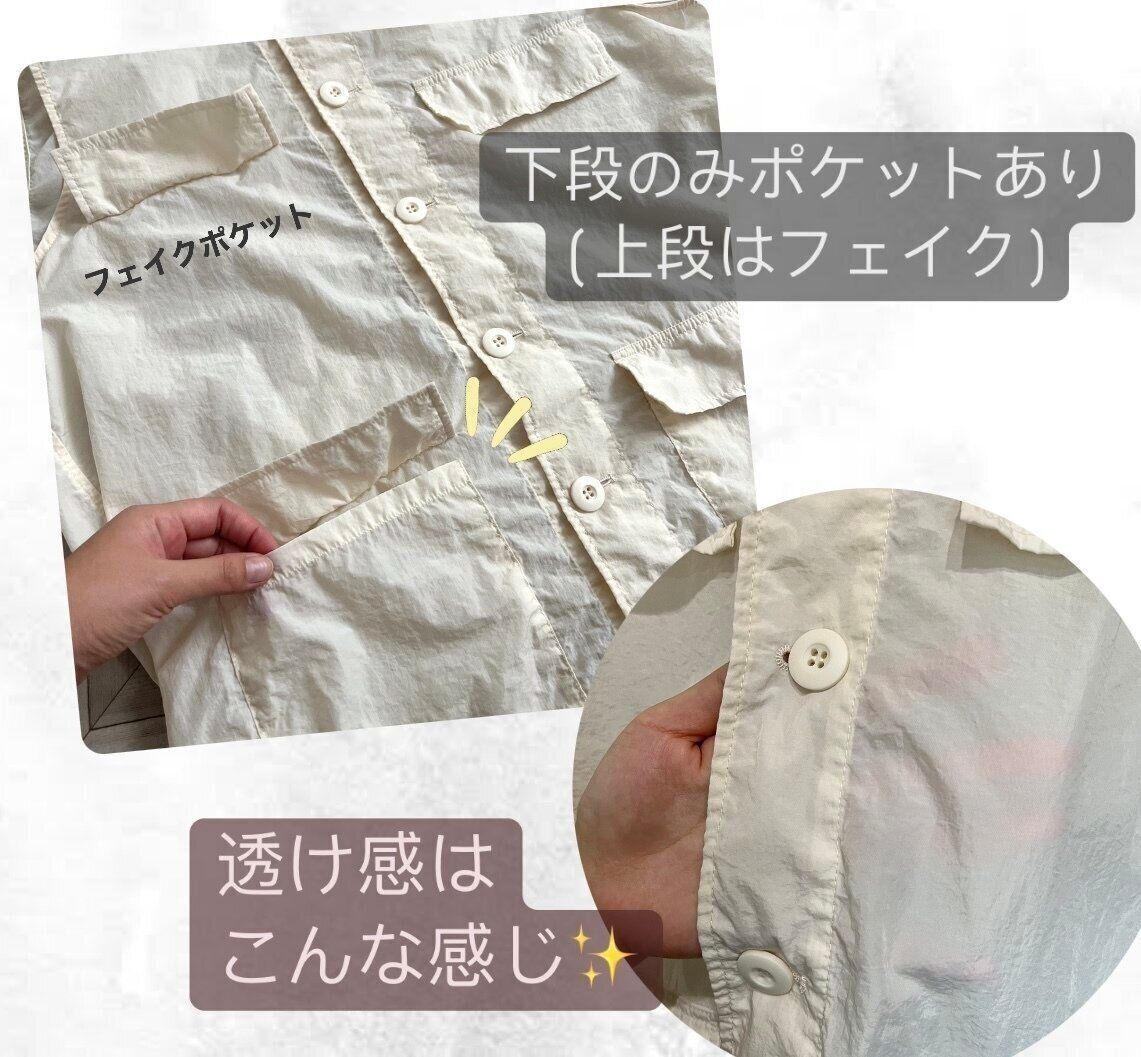 フロントの仕様ですが、下段のみポケットありで、上段はフェイクポケットになっています。透け感もややありなので、ロゴTシャツやプリントTシャツ、カラートップス合わせもオススメです。